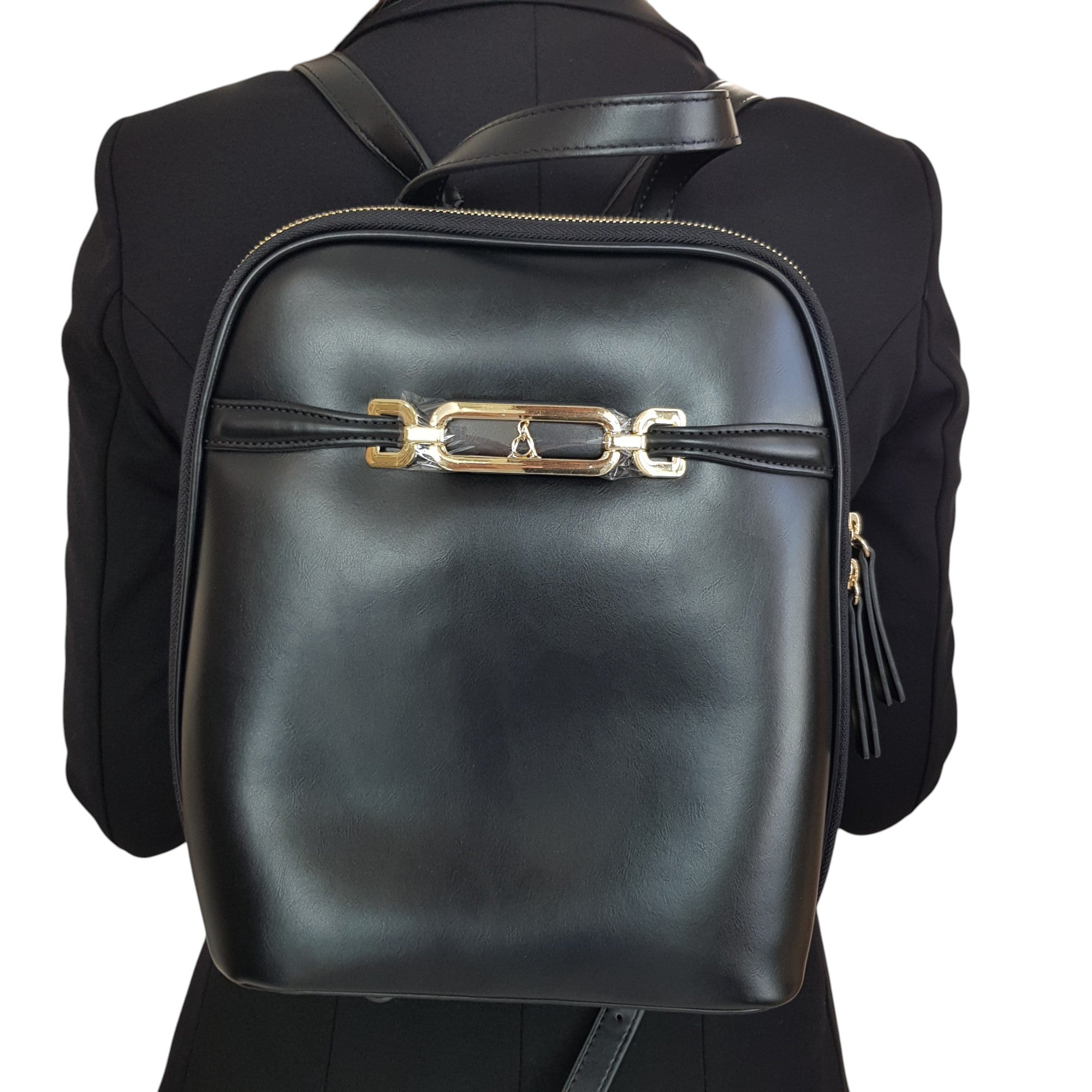 Zaino donna nero La chiusura zip. E' personalizzata con logo L'Atelier du Sac oro. Rif.1008