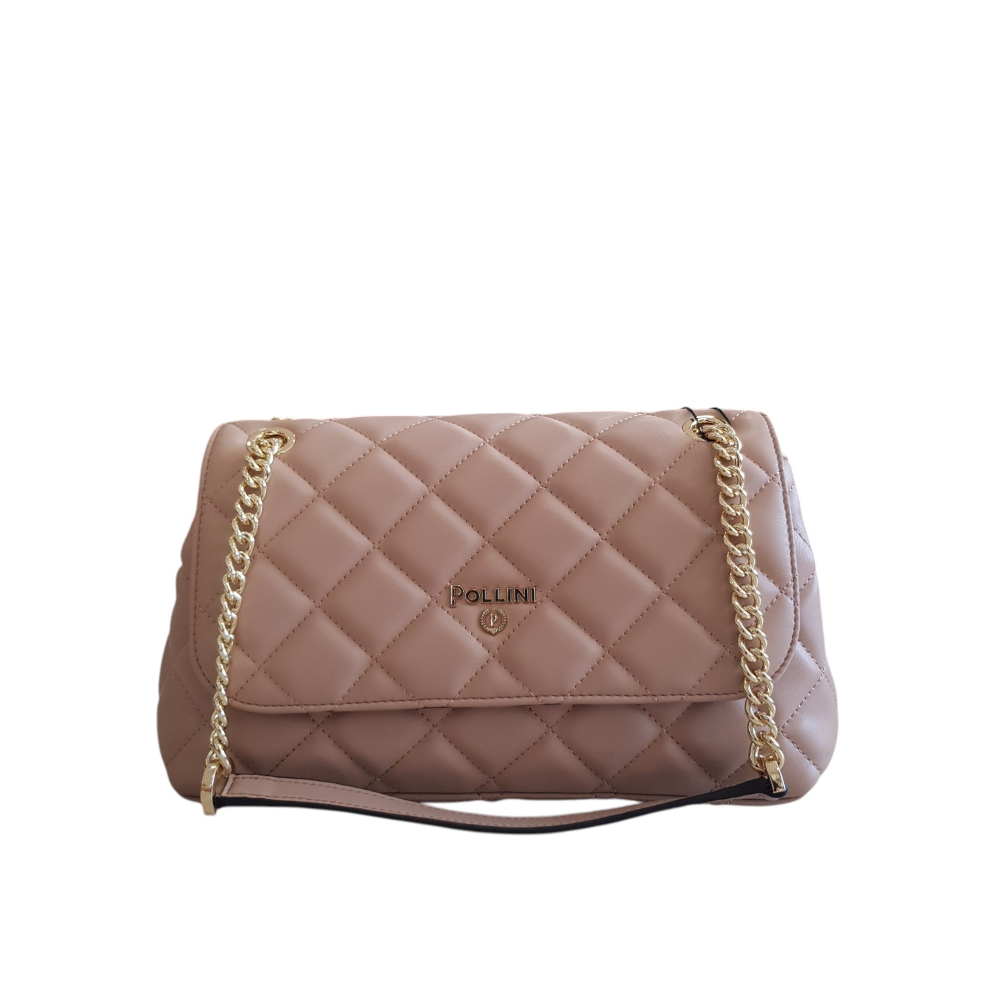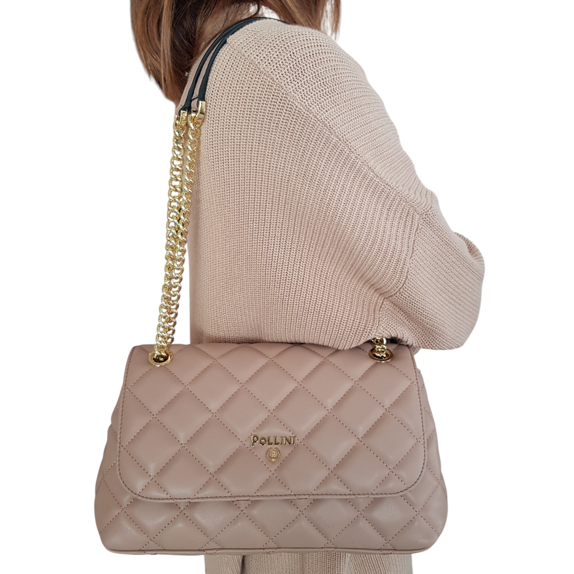 Borsa a spalla con lavorazione matelassé. Catena scorrevole con spallacci per una molteplice portabilità: a spalla, a mano e a tracolla. Due scomparti interni. Art.419