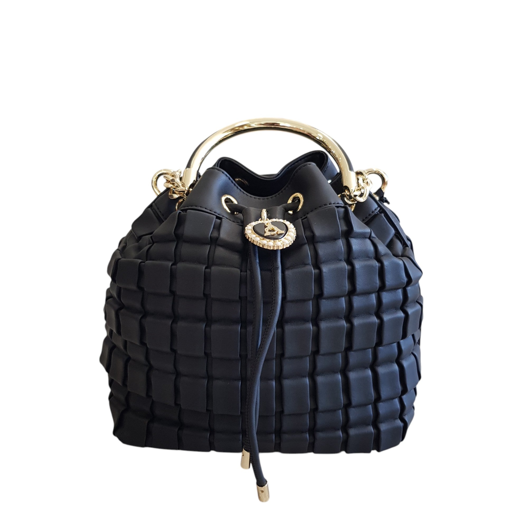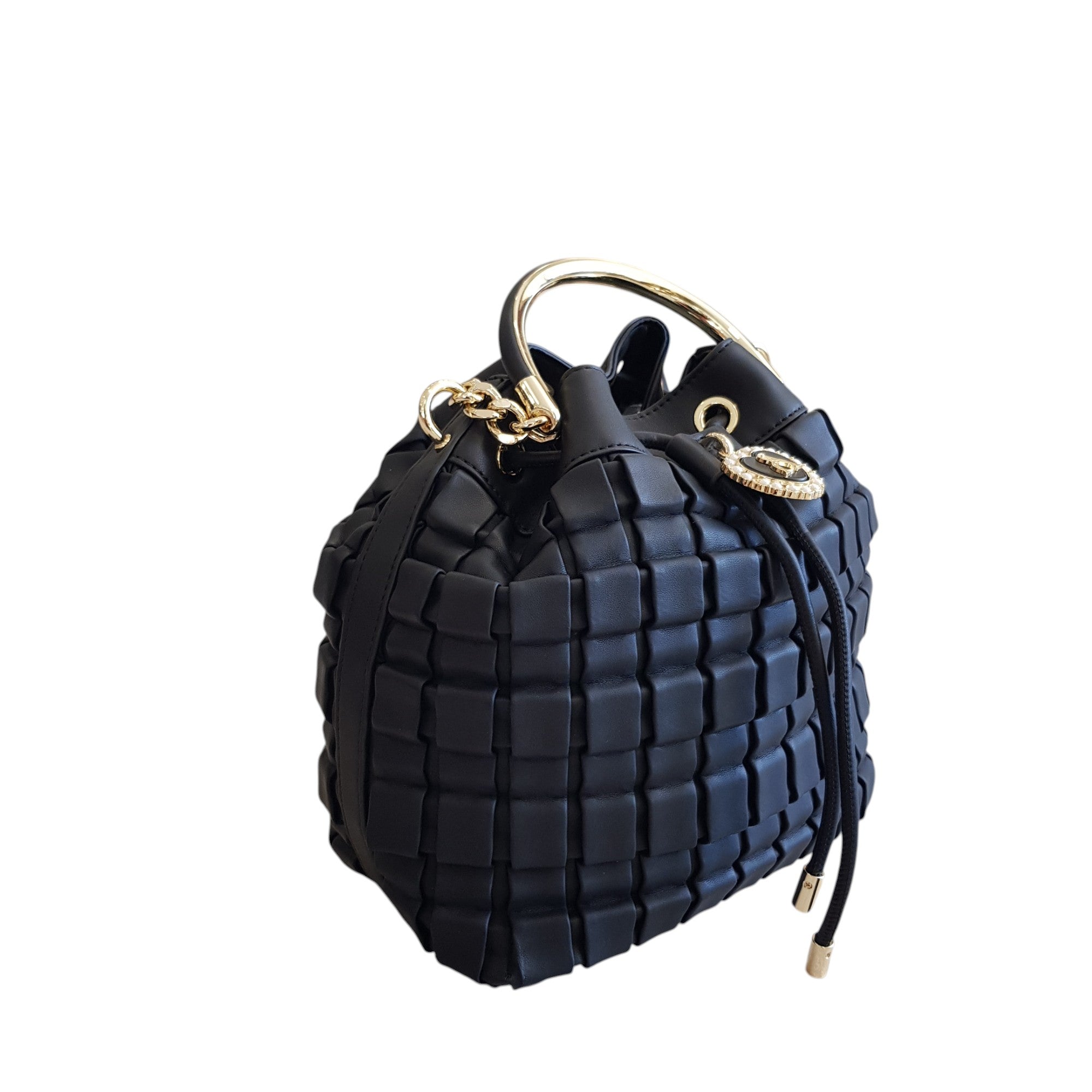 Borsa a secchiello impreziosita da charm a forma di cuore con logo L'Atelier du Sac. È dotata di manico. Chiusura magnete. Chiusura con coulisse. Rif.1010