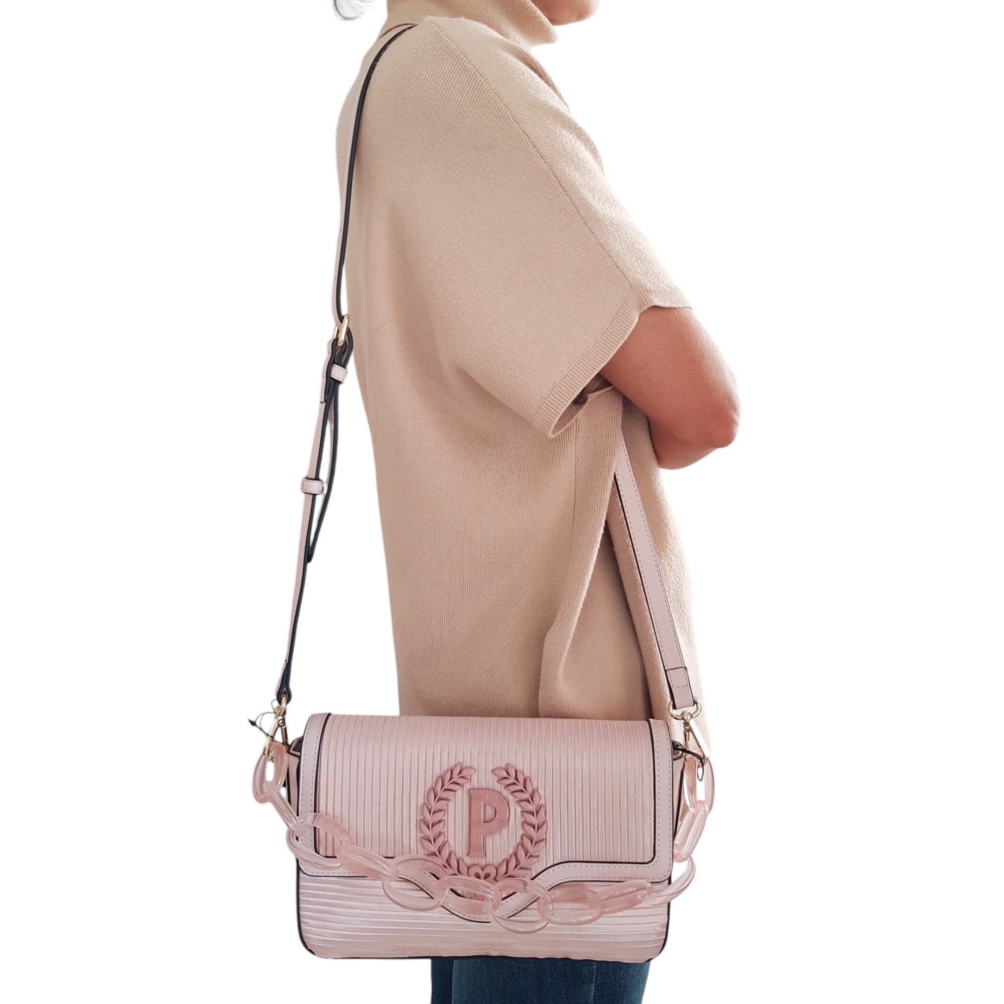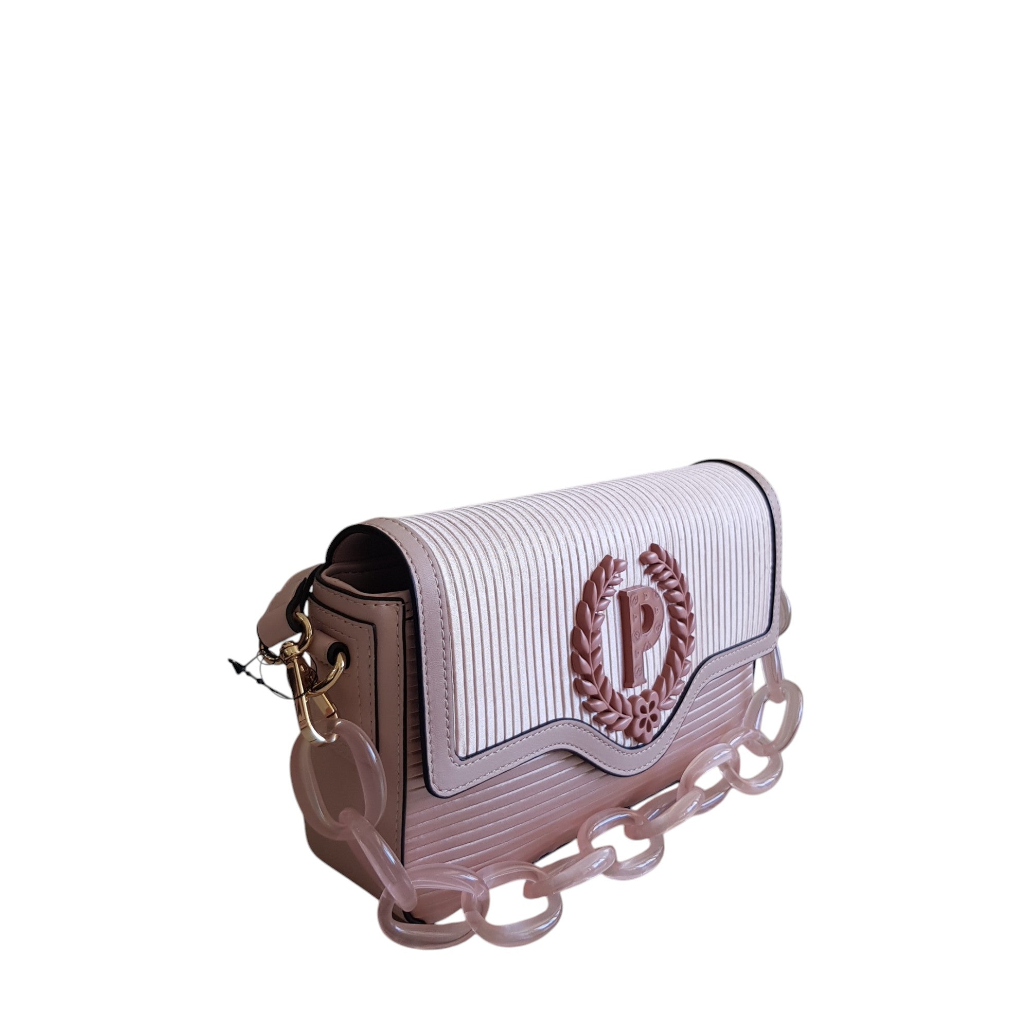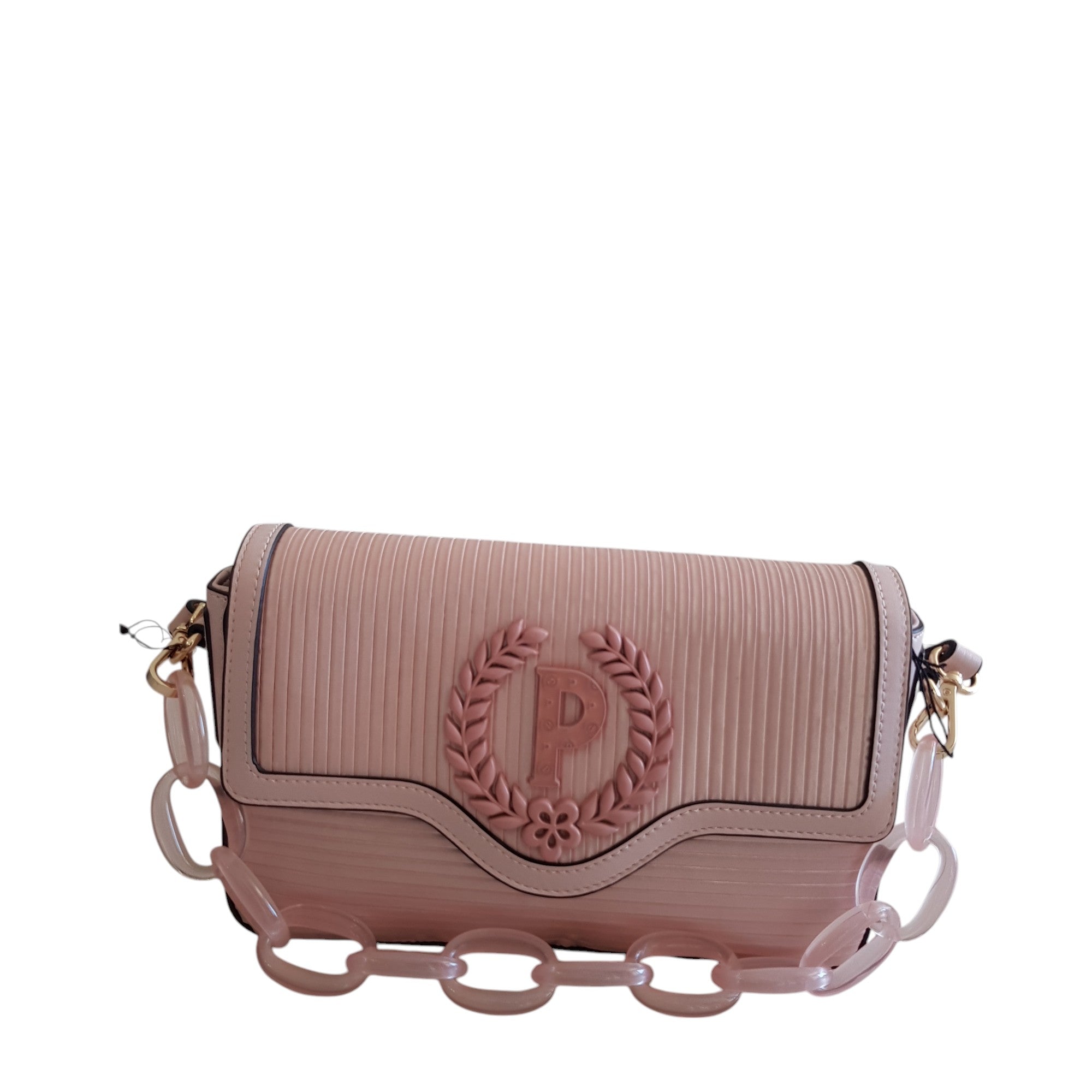 Pollini donna Borsa plisse' satina. Maxi catena colorata con effetto trasparente che funge anche da manico. Maxi logo P-alloro in metallo con effetto lucido-opaco. Portabilità molteplice: a mano, a spalla o a tracolla. Rif.407