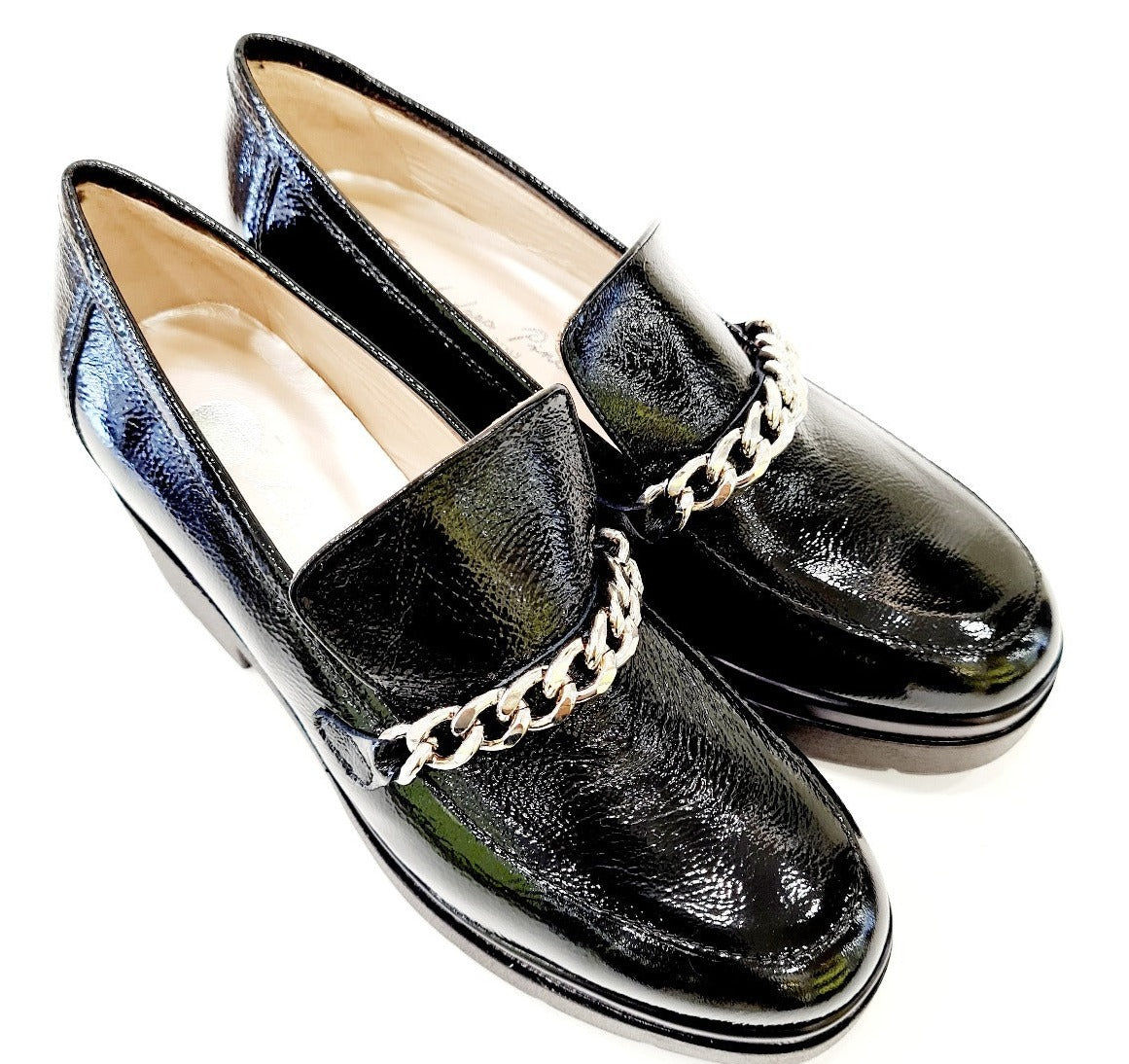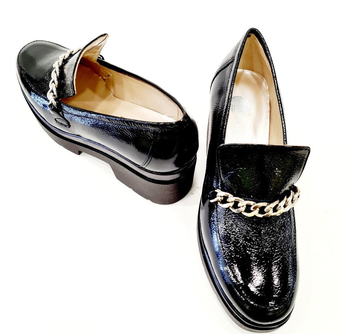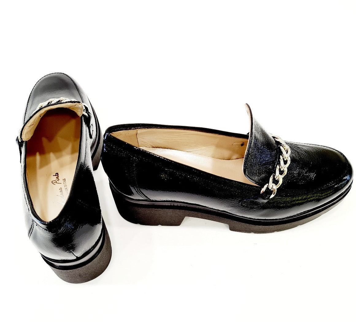 ANDREA PINTO MOCASSINO TACCO ALTO 5,5 CM PLATEAU 3 CM.PELLE NAPLAK NERO ACCESSORIO CATENA ACCIAIORIF.52