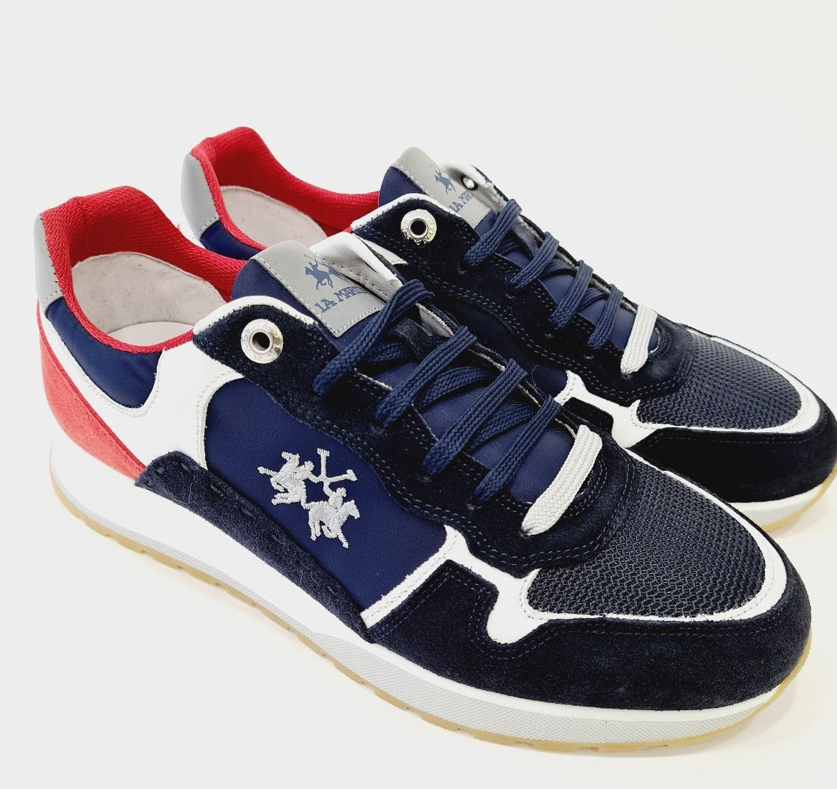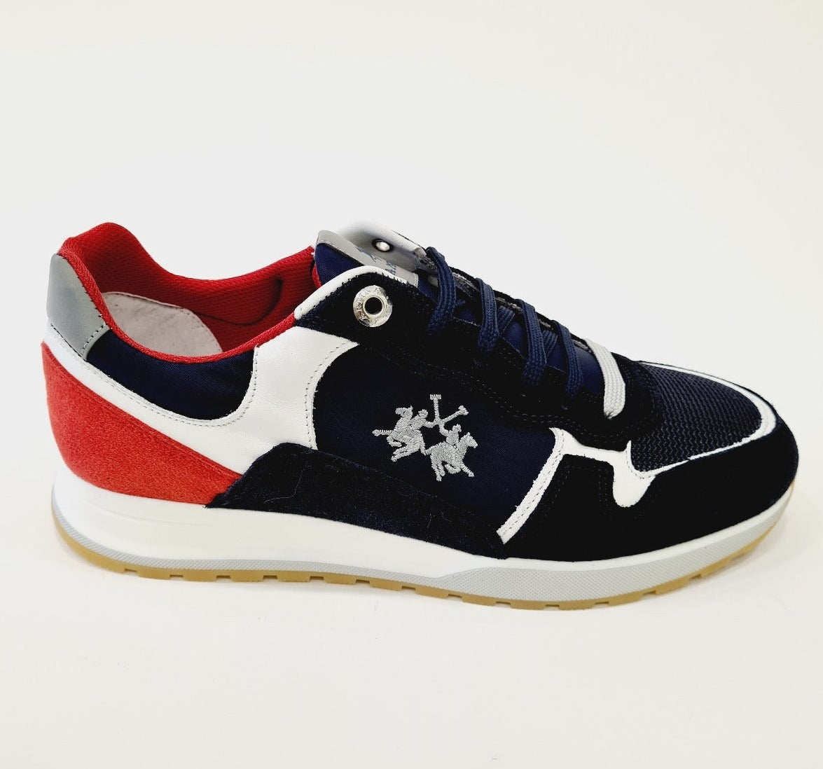 LA MARTINA SNEAKERS UOMO FONDO GOMMA ALTO 3,5 CM.CAMOSCIO BLU PELLE BIANCO E ROSSO RIF.12