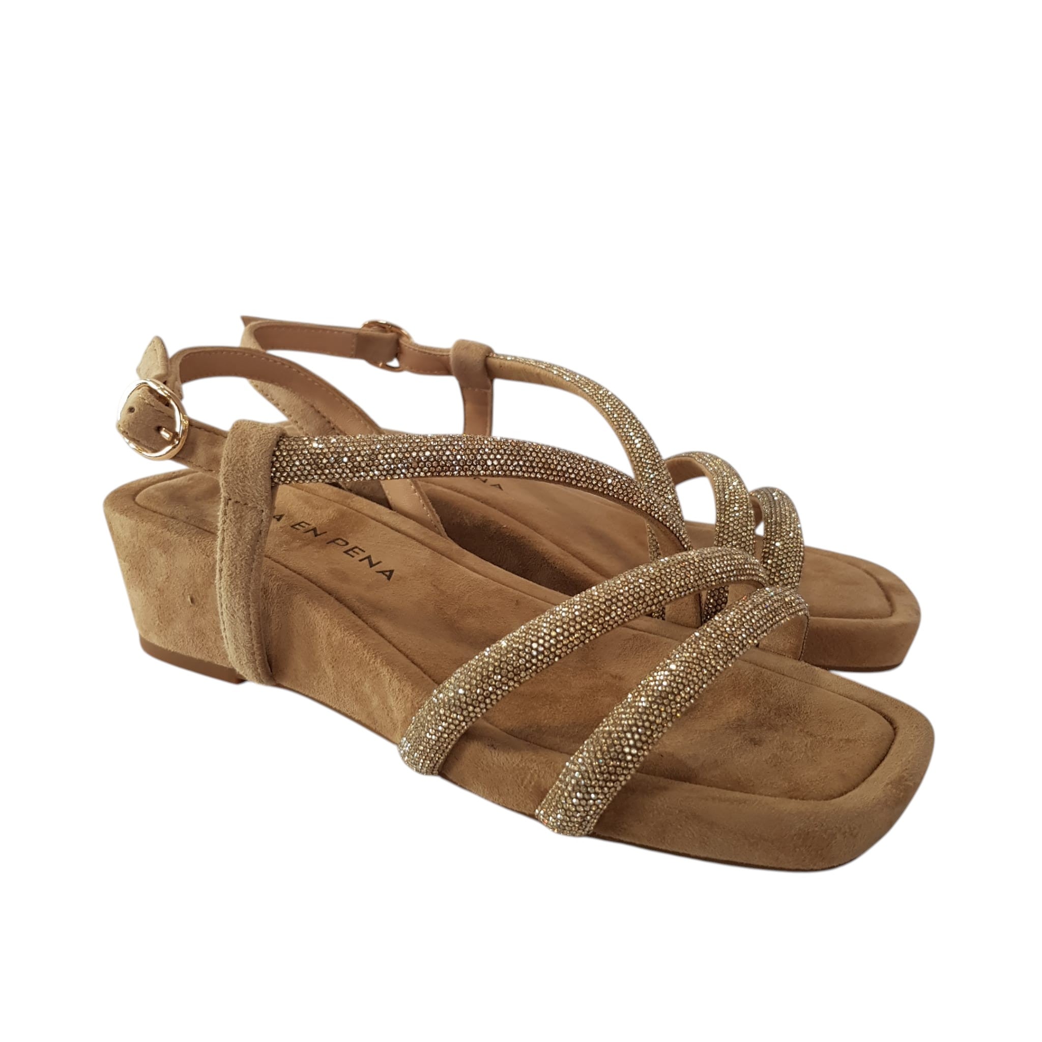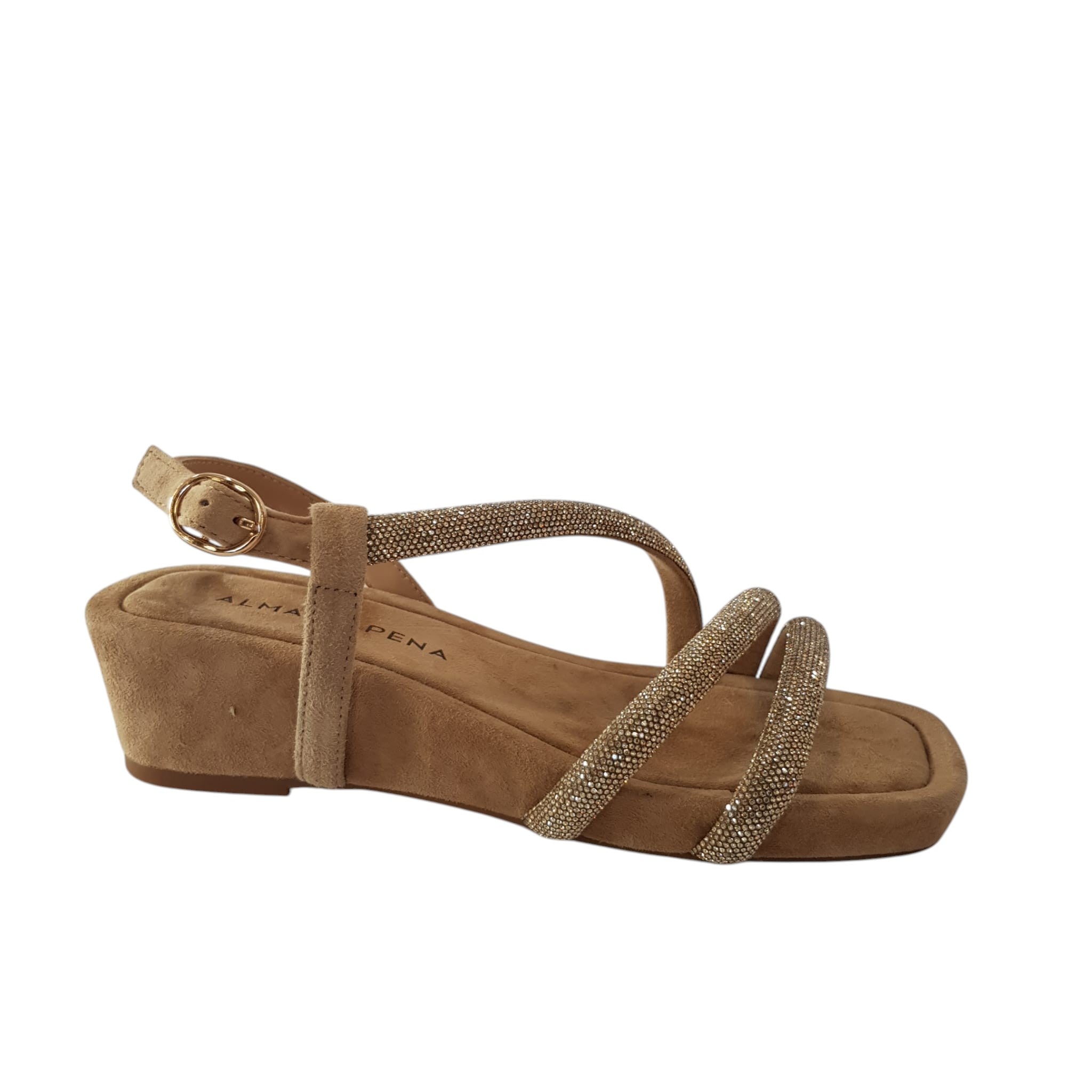 Alma en Pena Sandalo Donna Zeppa 5 cm. Camoscio Sand Strass Oro Rif.457