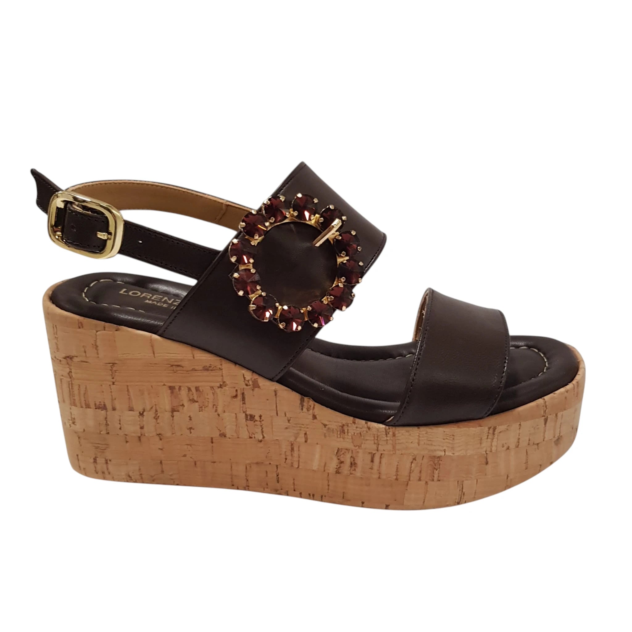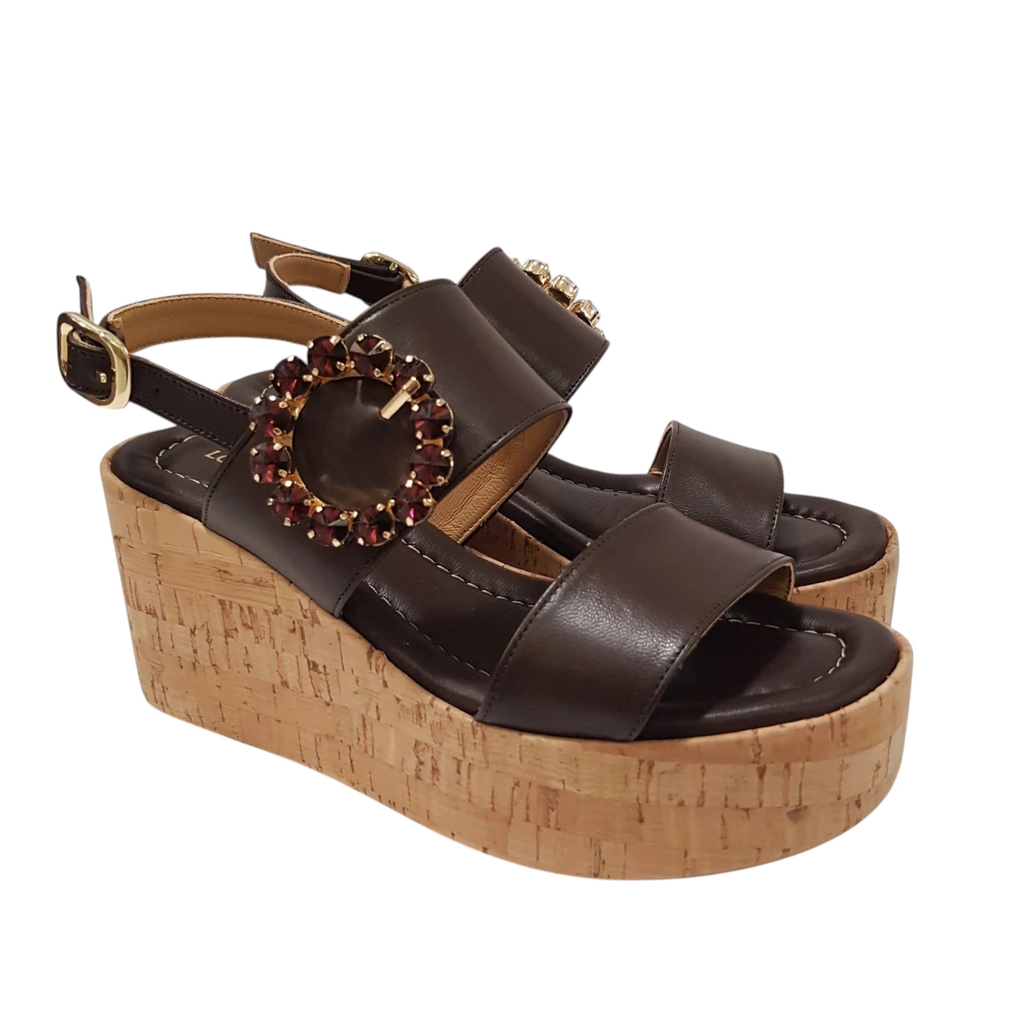 Lorenzo Mari Sandalo Donna Pelle Cioccolato accessorio pietre Moro zeppa Sughero alta 8,5cm. plateau 5 cm.Rif.876