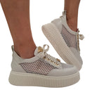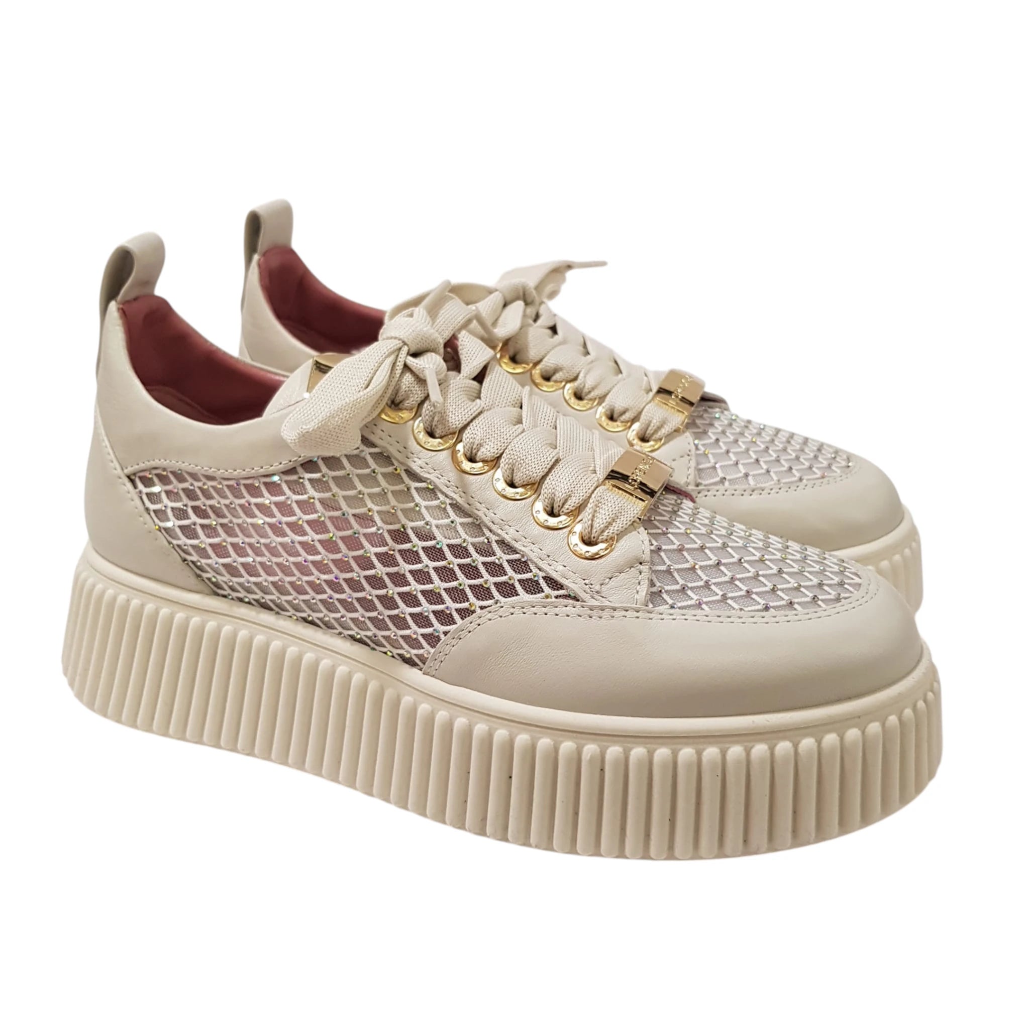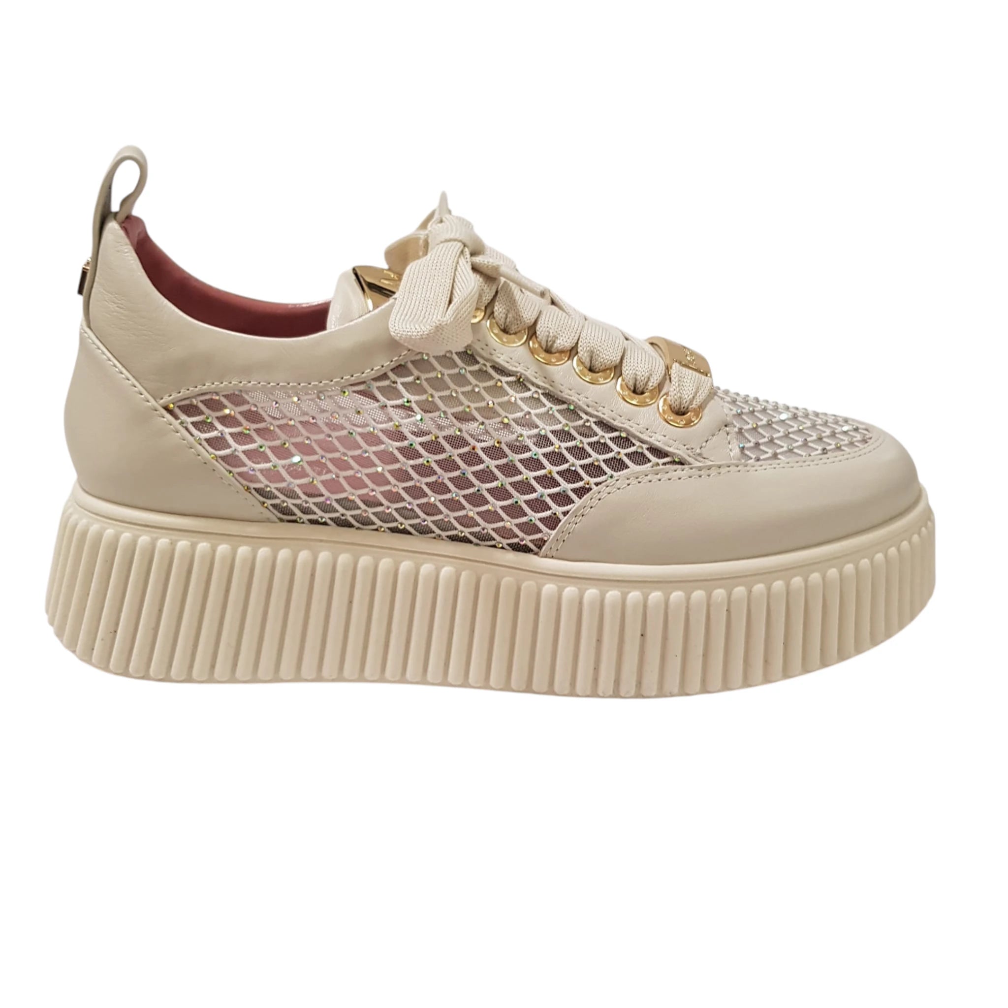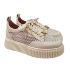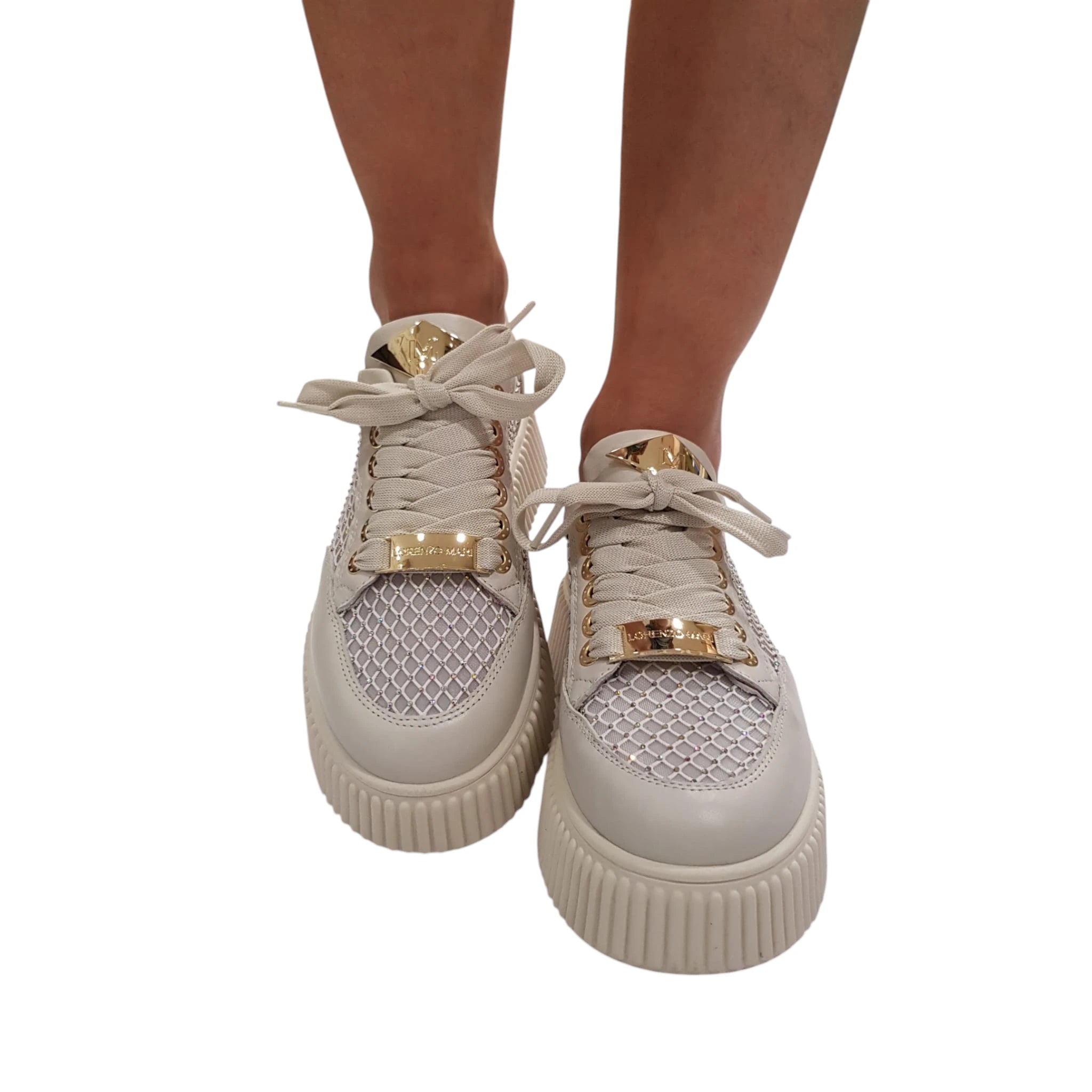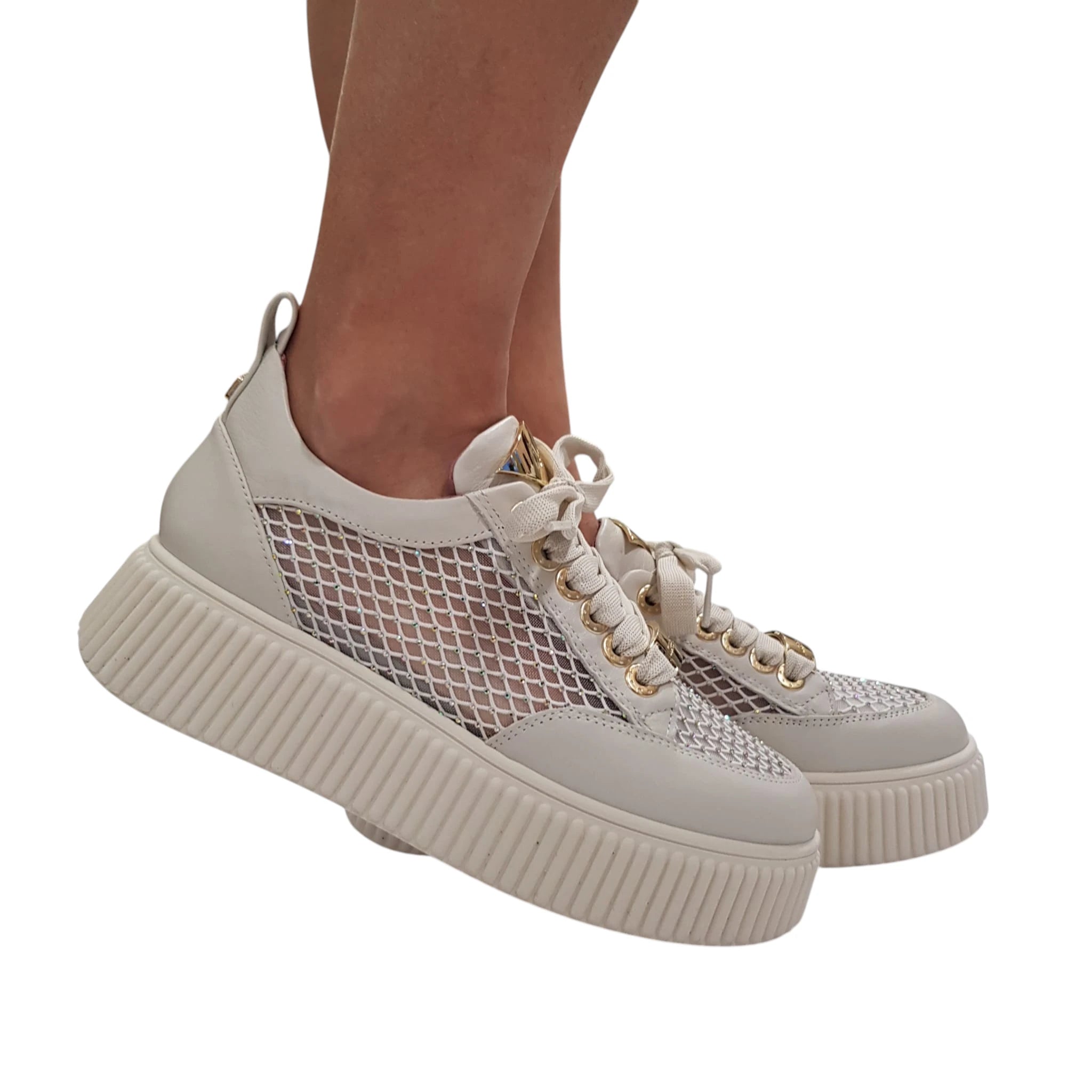 Lorenzo Mari Sneakers Donna Pelle latte e rete con glitter e accessorio oro fondo gomma Bianco alto 5 cm Rif.871
