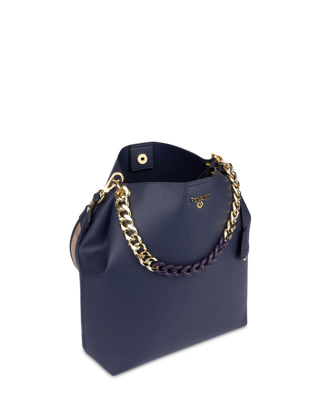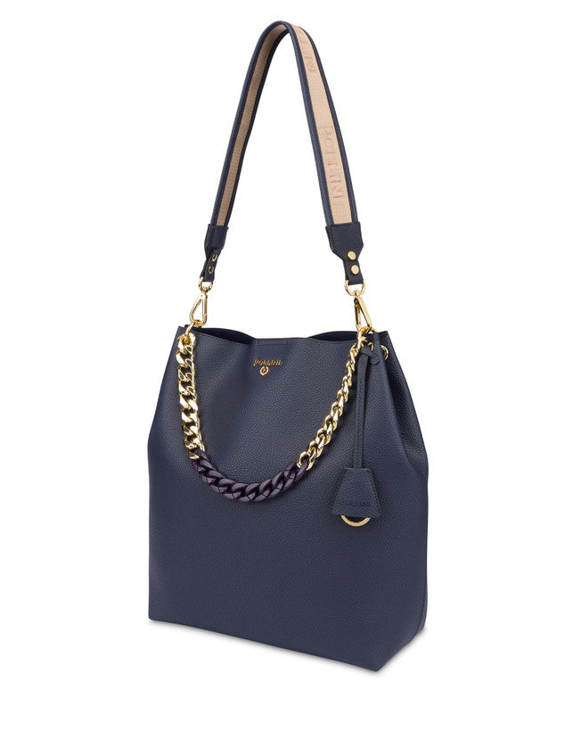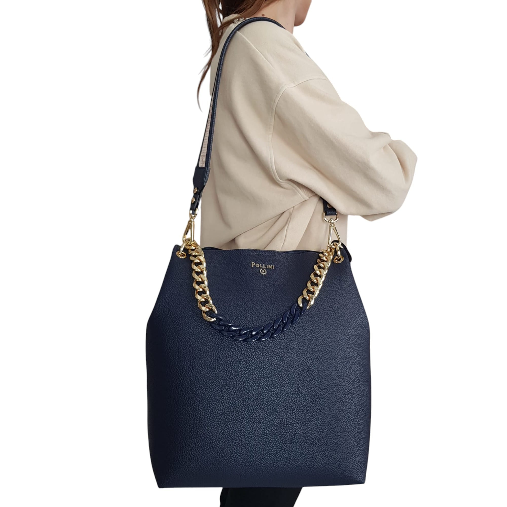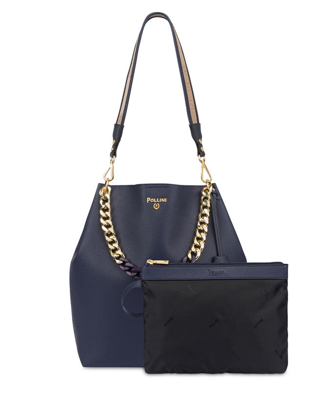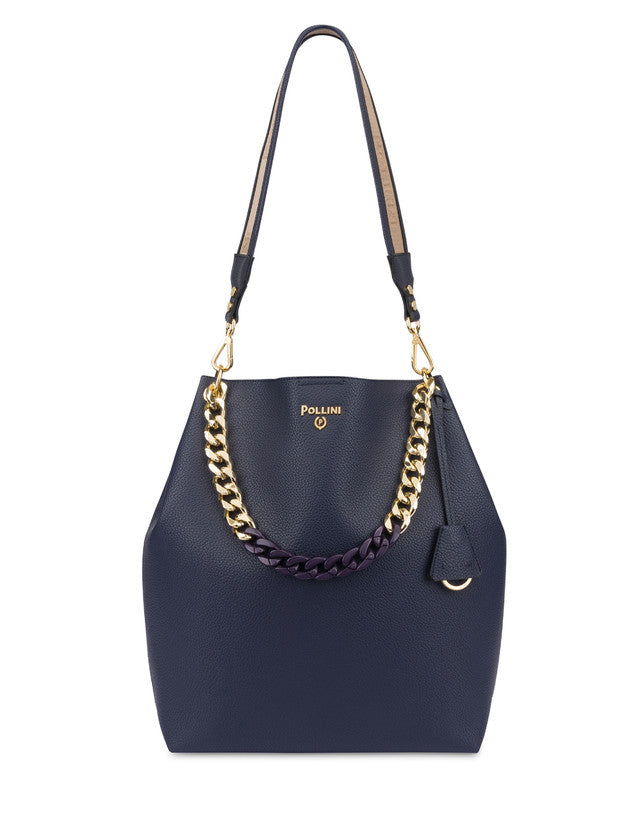Borsa dall’eleganza sofisticata. La silhouette pulita ed essenziale è arricchita da una catena frontale funzionale anche da manico, logo Pollini oro. Tracolla removibile Art.767