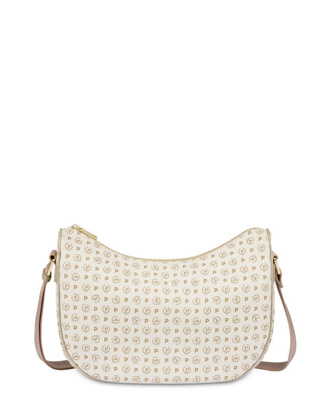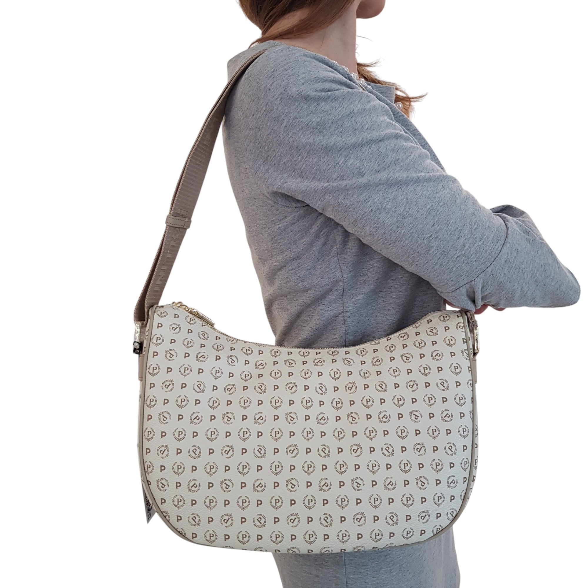 Hobo bag collezione Heritage PVC. L'iconico pattern all over dona un'allure elegante e senza tempo. Il nastro logato Pollini percorre tutto il fianco della borsa, trasformandosi in tracolla. Art.402