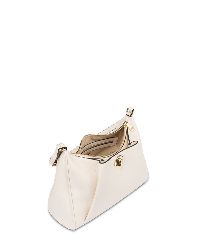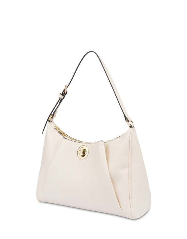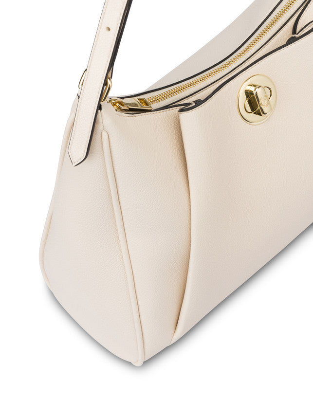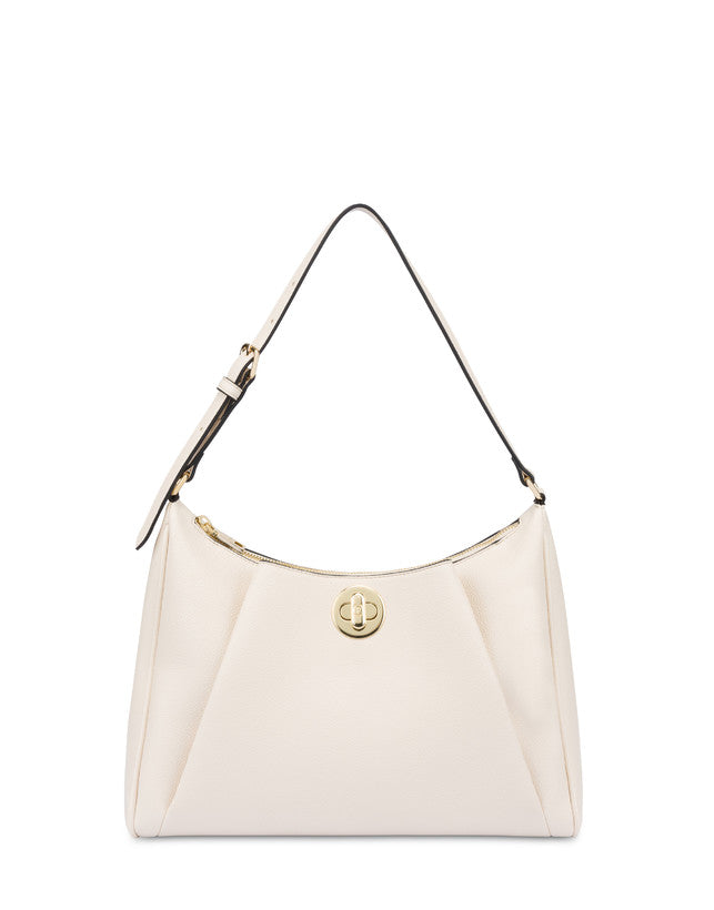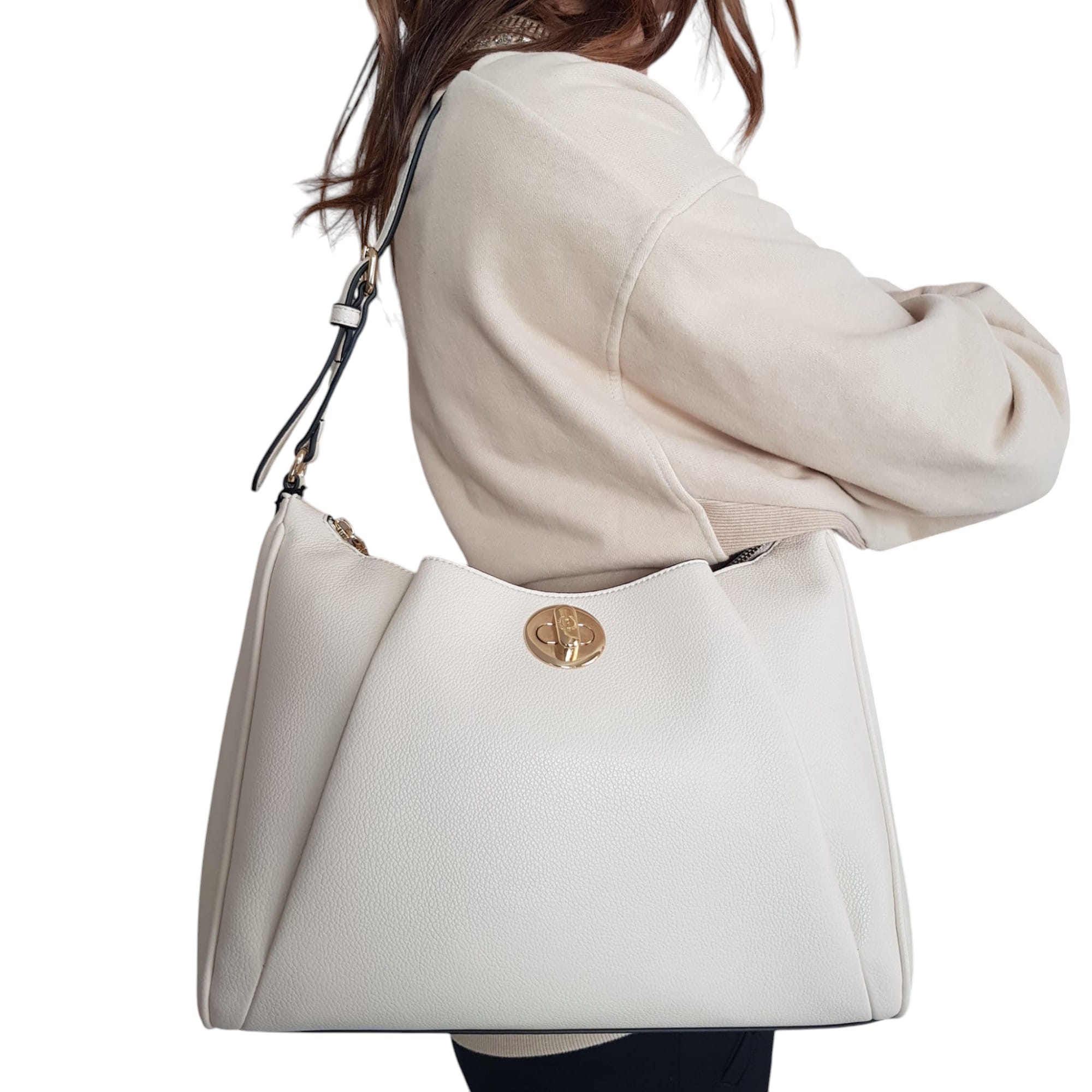 Borsa tote dall’eleganza sofisticata. La silhouette pulita ed essenziale è arricchita da una maxi piega frontale, che si trasforma in una tasca funzionale con chiusura a girello in galvanica light gold. Chiusura borsa con zip. Art.775