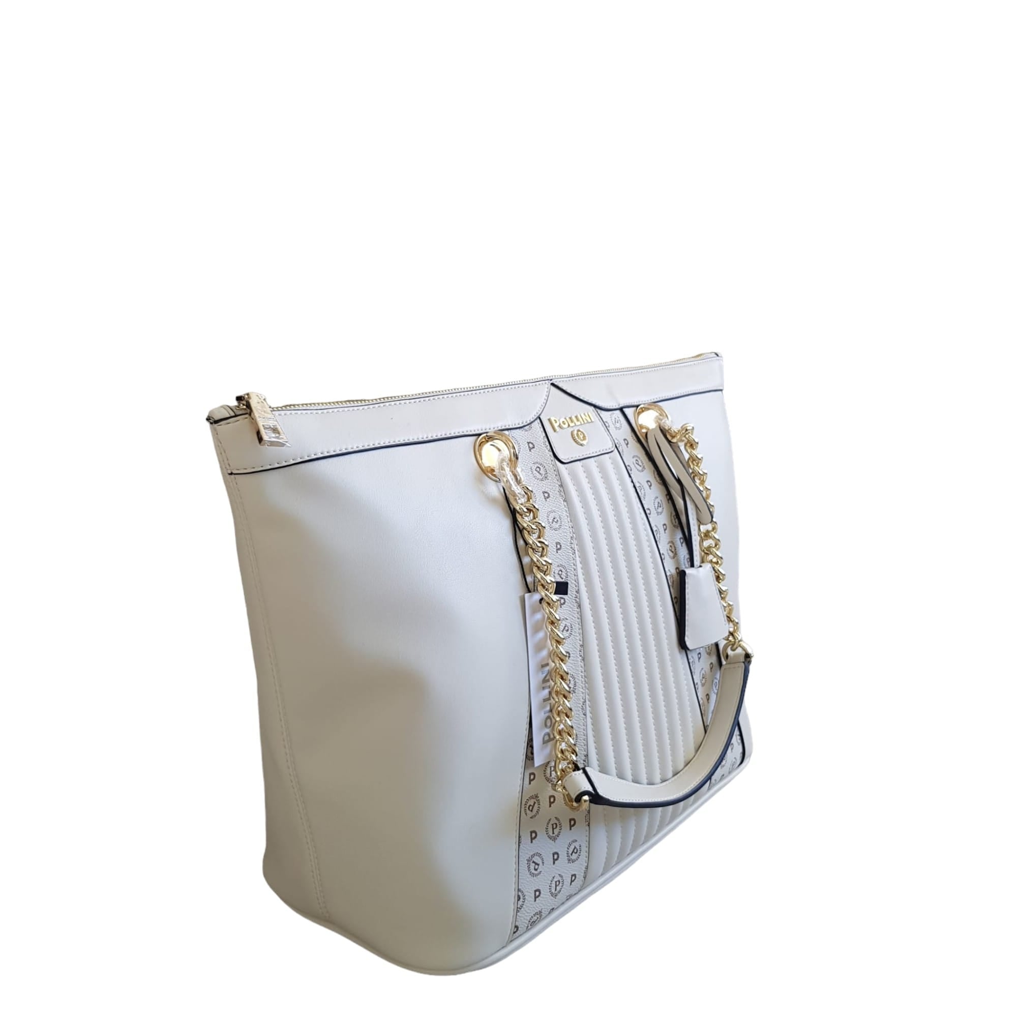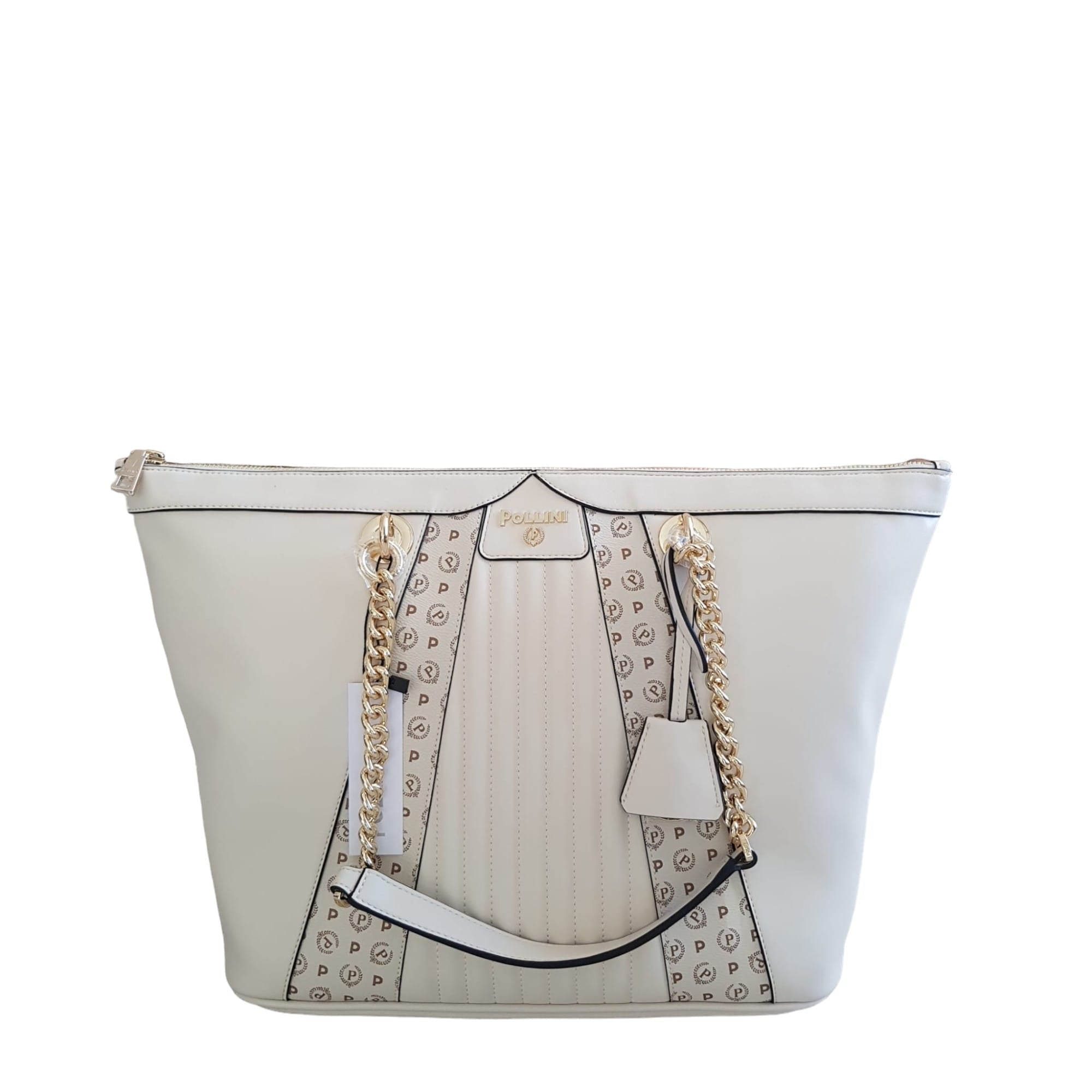 Pollini Borsa donna con l'inconfondibile pattern all over combinato al morbido matelassé dal taglio verticale. Manici in catena con spallaccio portabilità a spalla. Rif.871