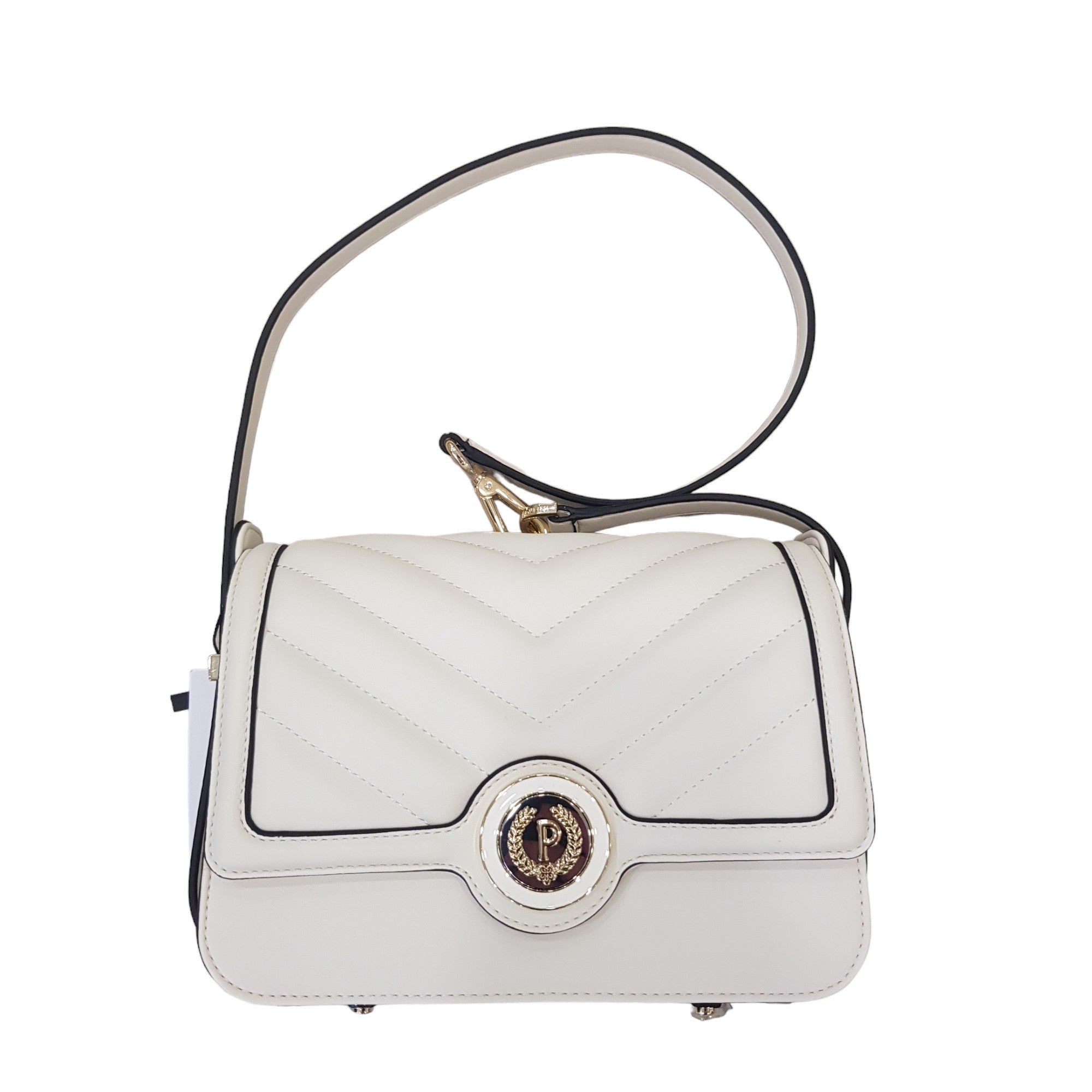 Pollini Borsa a tracolla con lavorazione matelassé effetto spigato. Nuovo accessorio con logo P-alloro in smalto e specchio. Rif. 873