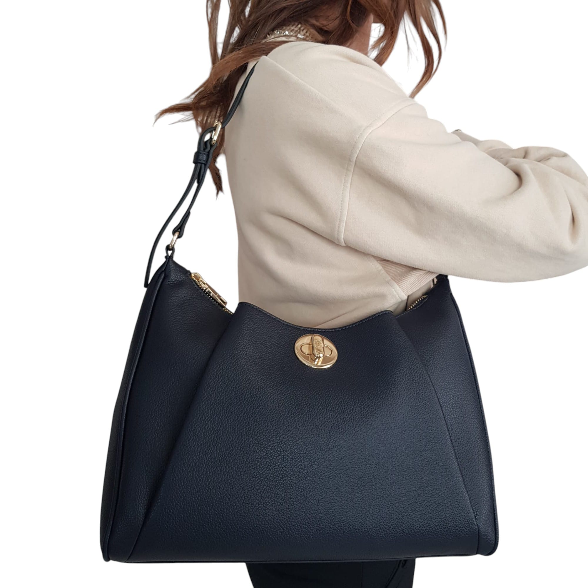 Borsa tote dall’eleganza sofisticata. La silhouette pulita ed essenziale è arricchita da una maxi piega frontale, che si trasforma in una tasca funzionale con chiusura a girello in galvanica light gold. Chiusura borsa con zip. Art.768