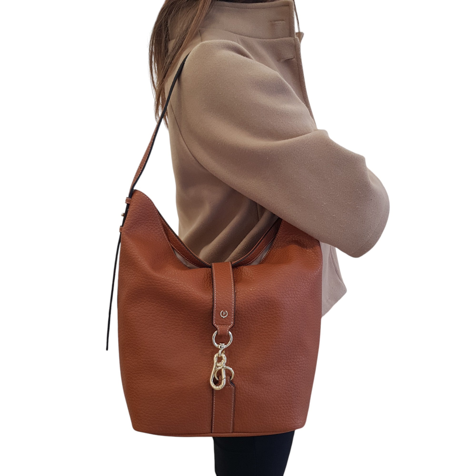 Borsa hobo dalla costruzione essenziale e destrutturata. Chiusura a moschettone centrale in galvanica oro chiaro e cuciture a contrasto color écru. Art.780