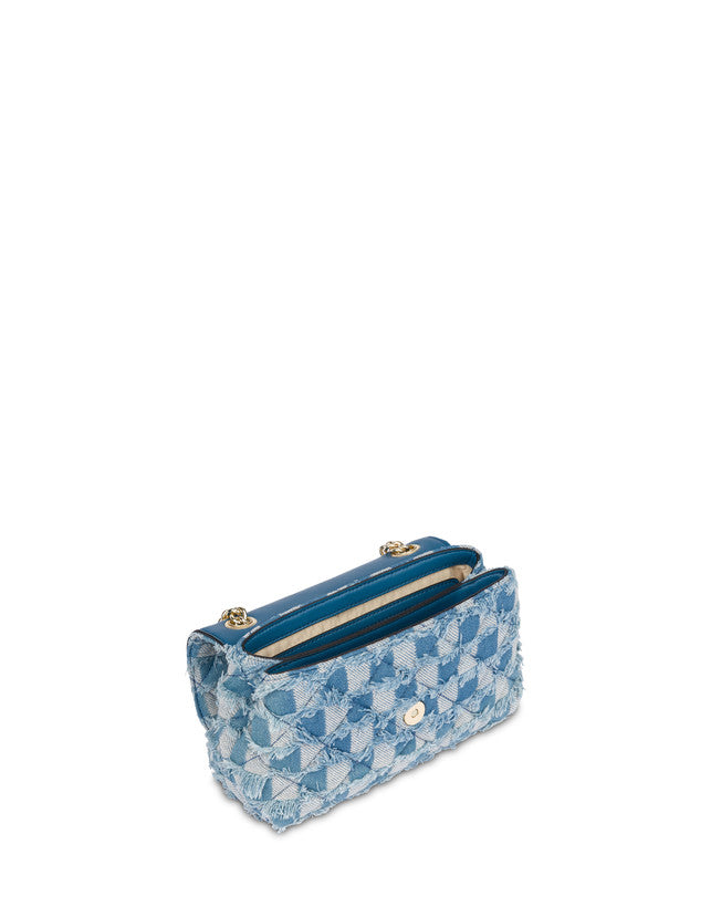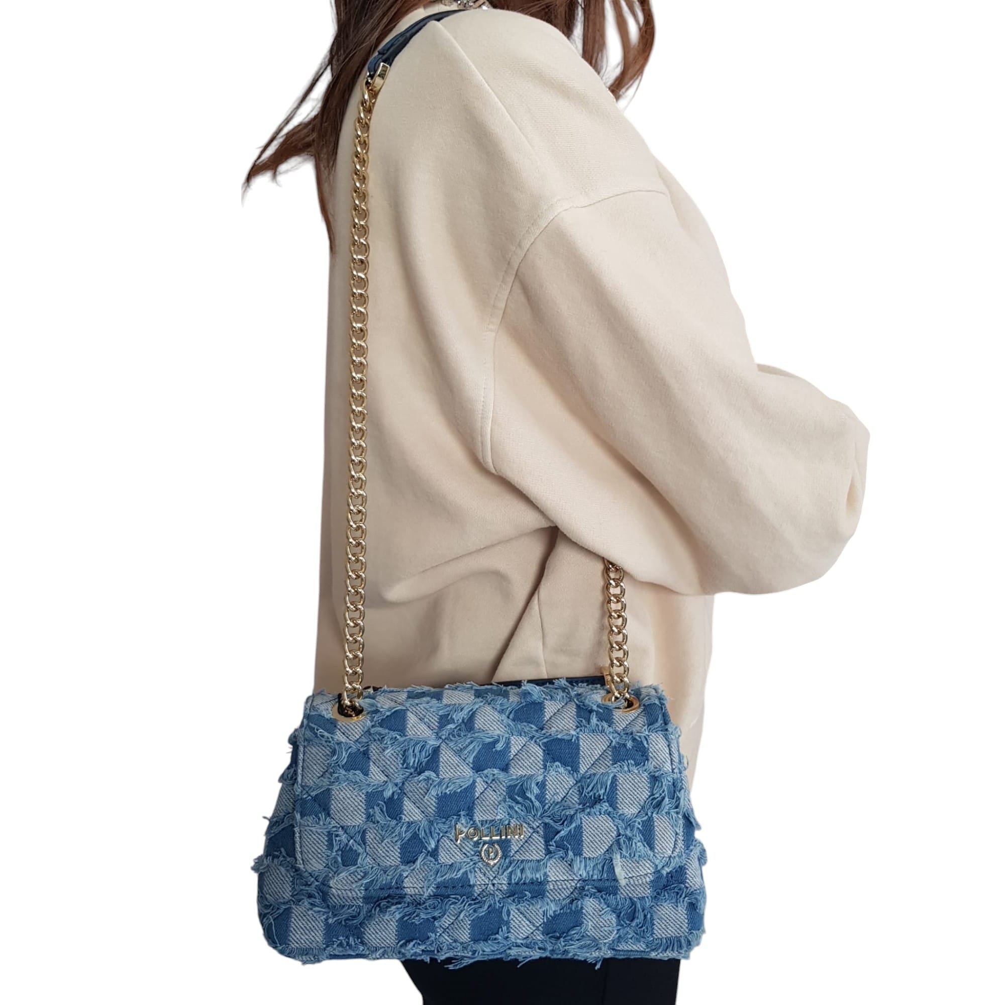 Piccola borsa a spalla in denim con lavorazione effetto check. Catena scorrevole con spallacci per una molteplice portabilità: a spalla, a mano e a tracolla. Due scomparti interni. Art.765