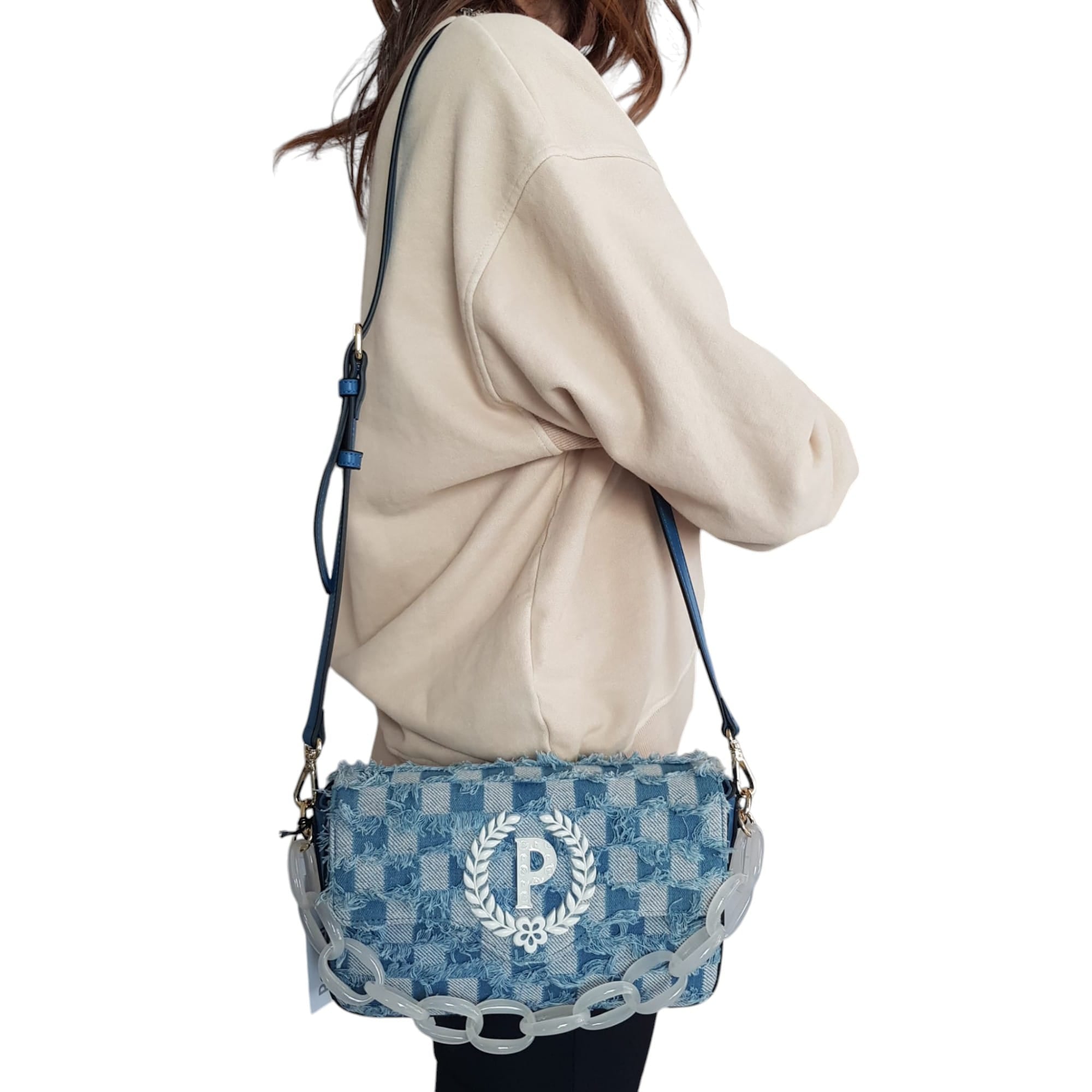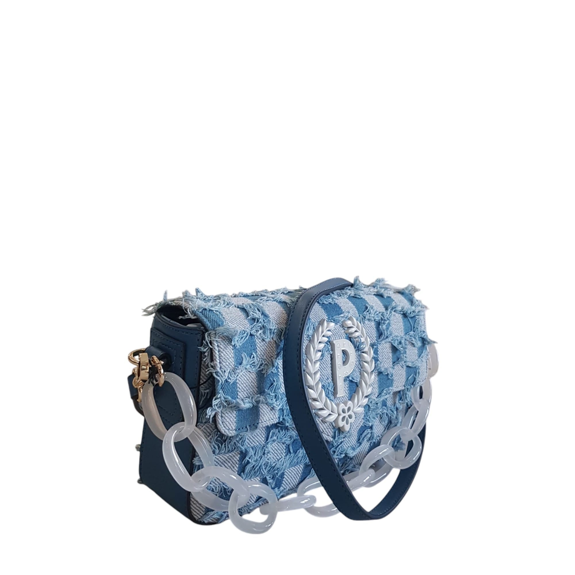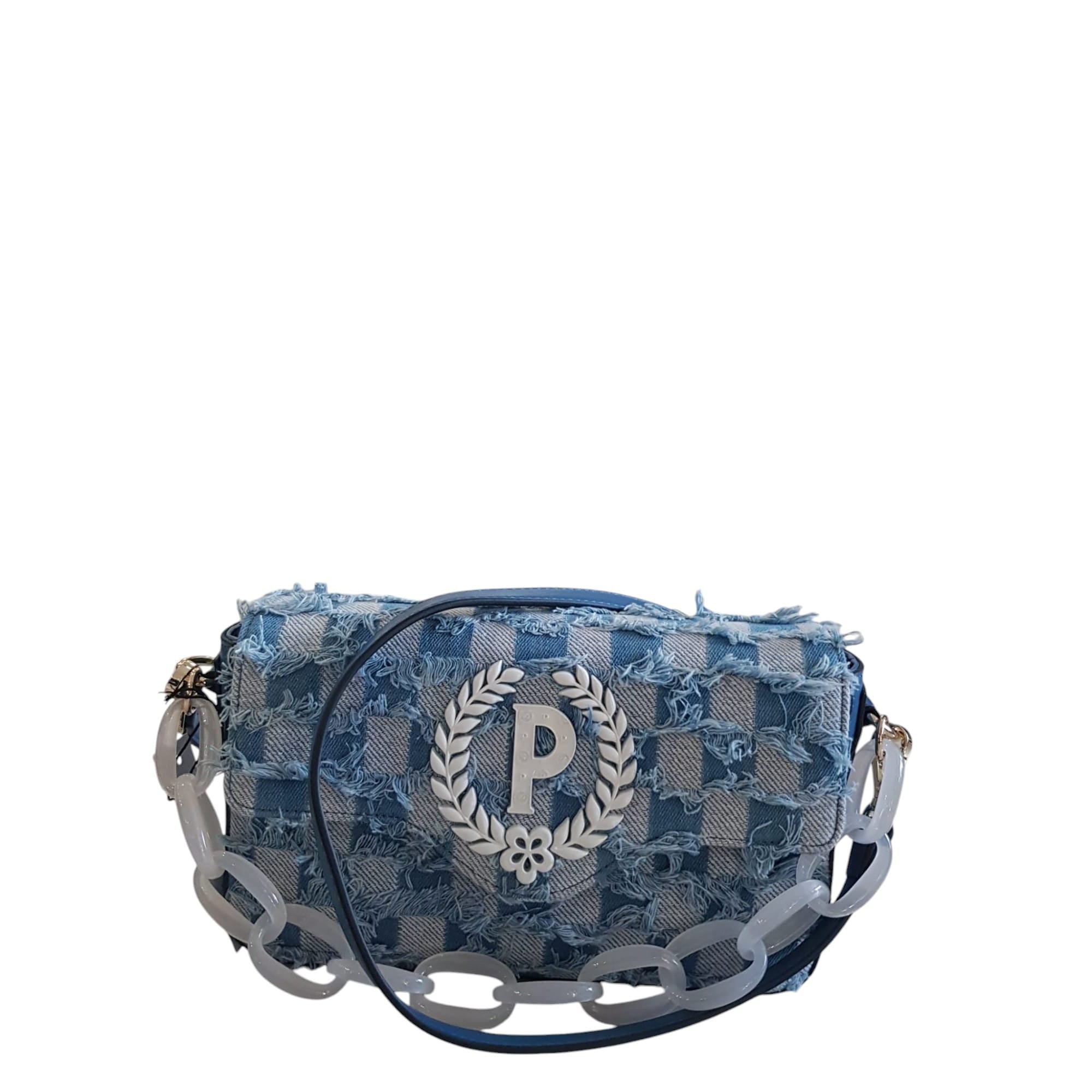 Borsa in denim con lavorazione effetto check, dalla portabilità molteplice: a mano, a spalla o a tracolla. Maxi catena in tinta con effetto trasparente che funge anche da manico. Maxi logo P-alloro in tinta con pattern Heritage a rilievo. Art.766