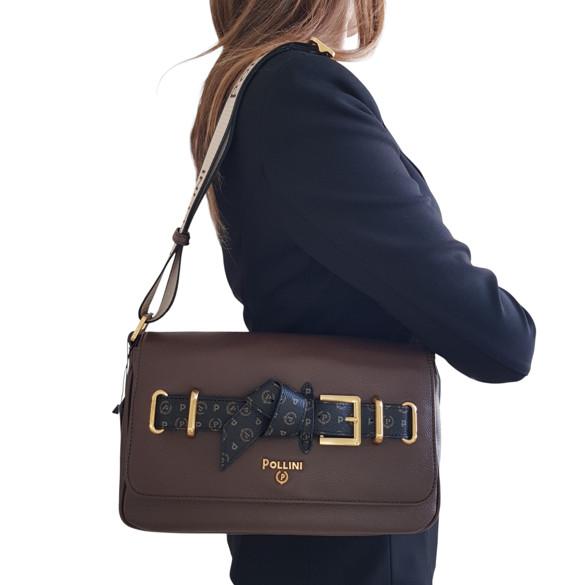 Pollini borsa si distingue per la sua silhouette lineare. perfetta sintesi di stile e funzionalità. E' impreziosita tracolla regolabile in jacquard logato e metalleria con finitura nickel. Il charm con logo “P Alloro” firma con carattere un accessorio versatile, ideale per accompagnare ogni giornata con classe.