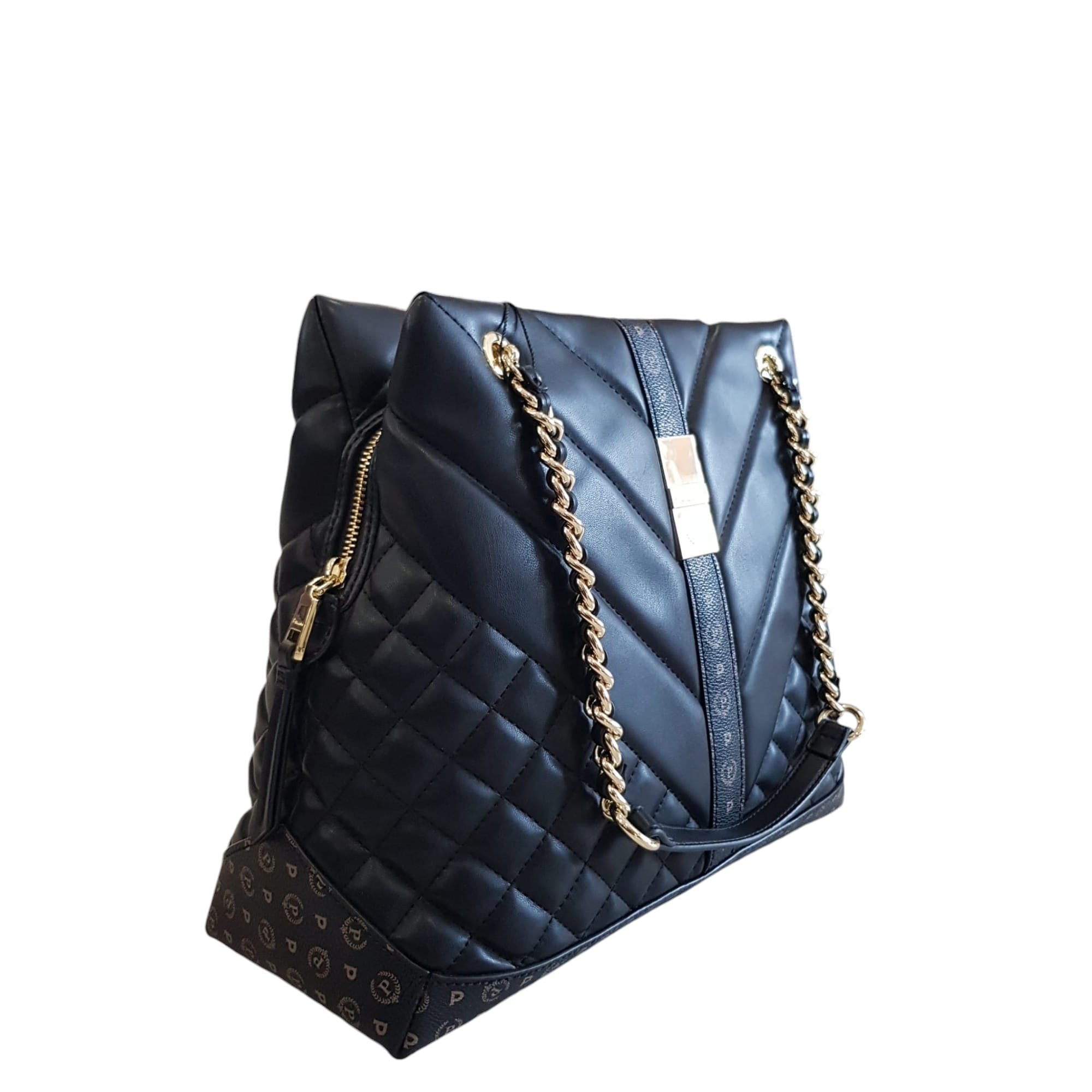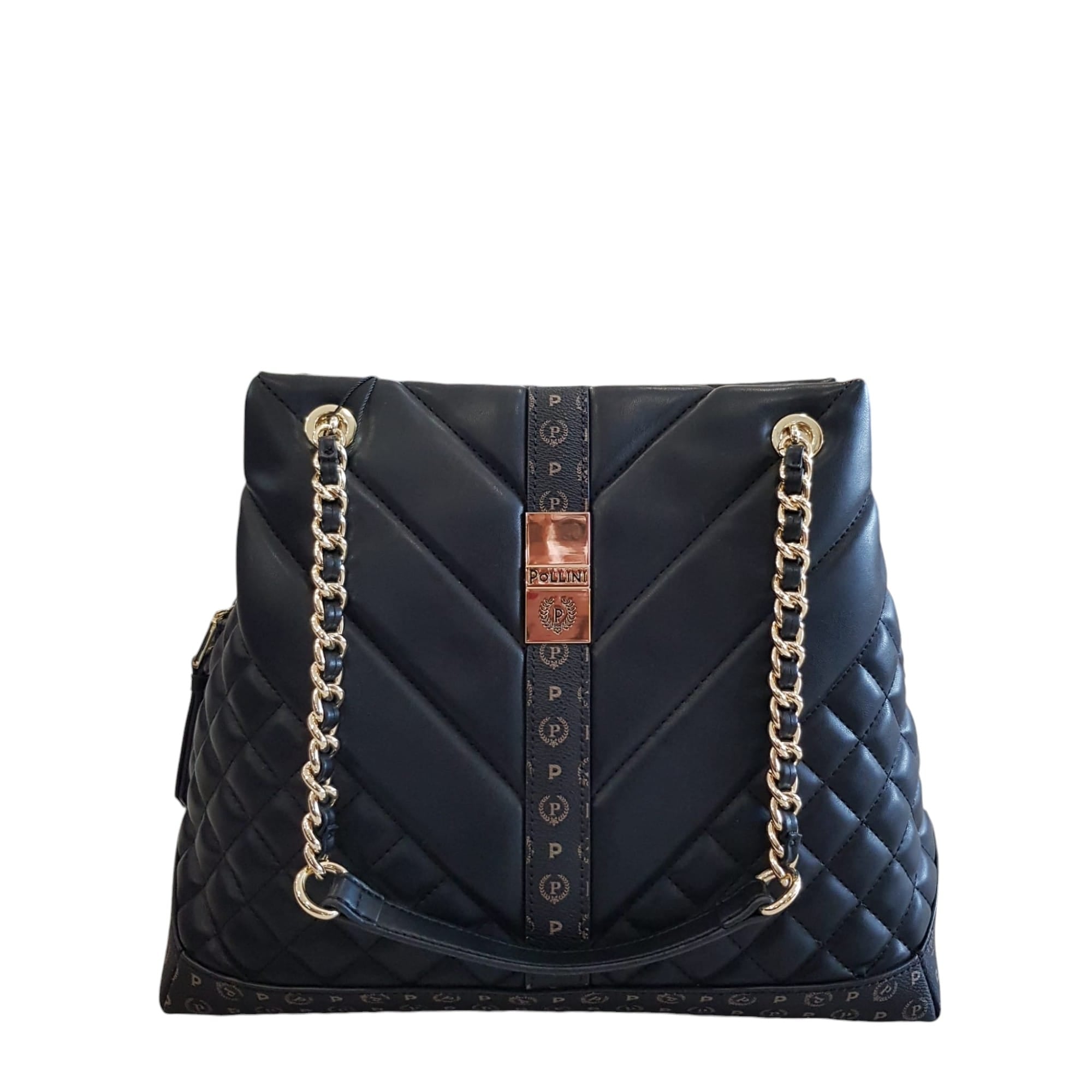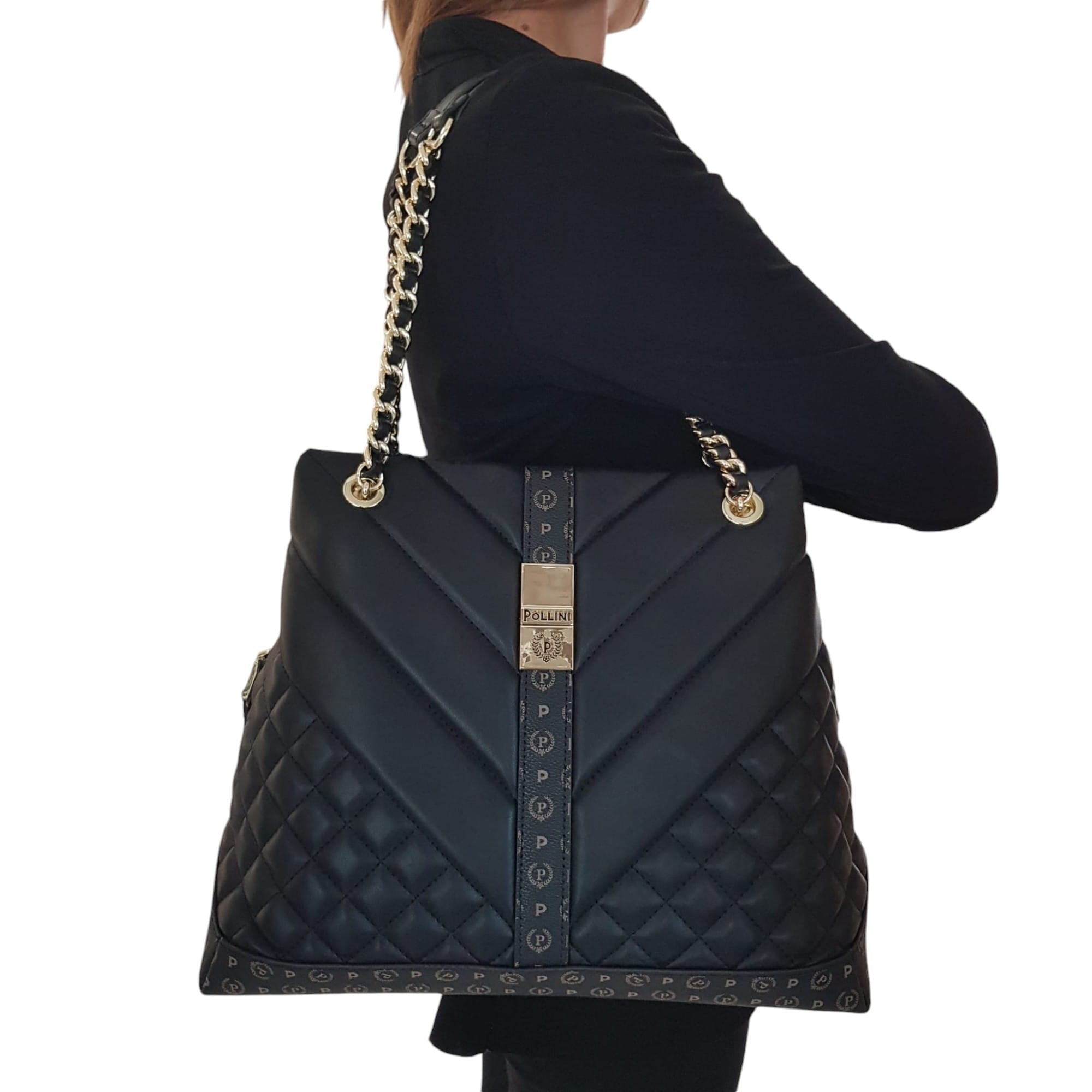 Pollini donna Borsa tote con lavorazione matelassé con effetto geometrico degradé. Il quadrante frontale si impreziosisce di una nuova placca metallica logata, effetto gold. Manici in catena con infilatura in tinta. Art.730