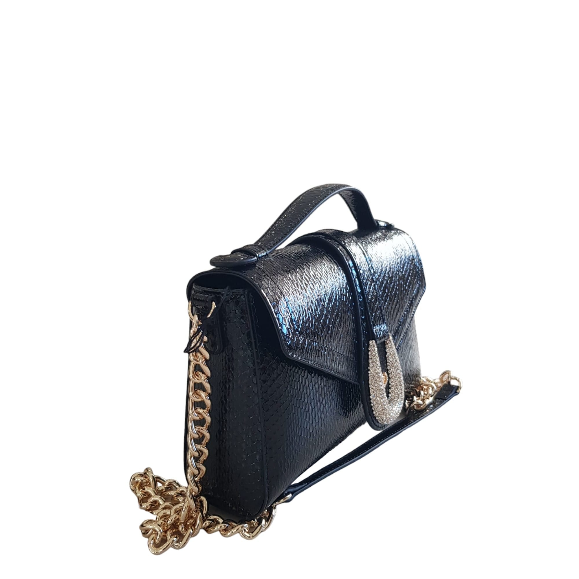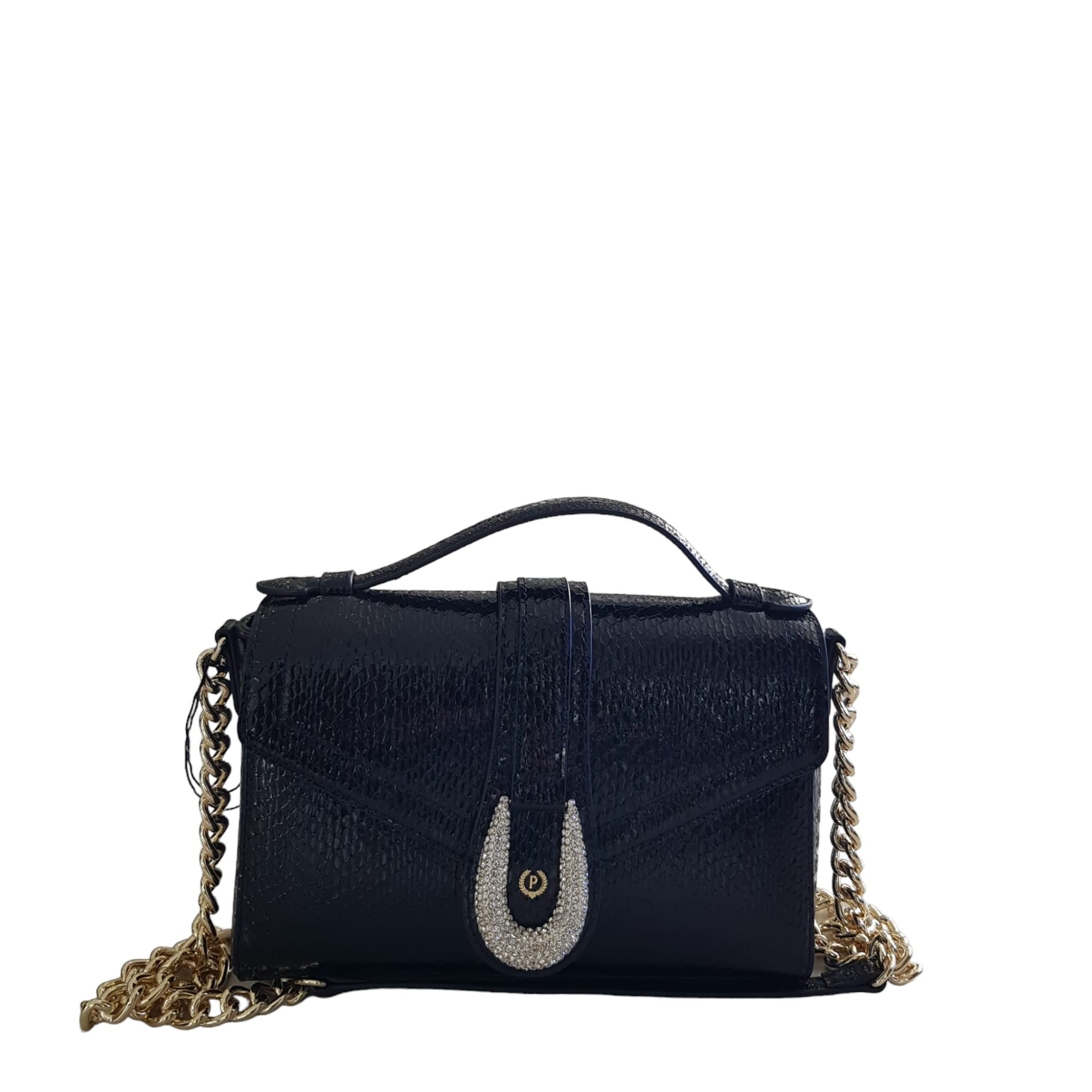 Pollini donna Borsa a mano, dimensione mini con stampa pitone dalla finitura lucida, resa ancora più preziosa dalla nuova chiusura adornata di lucenti cristalli. Tracolla a catena con spallaccio per una molteplice portabilità. Rif. 889