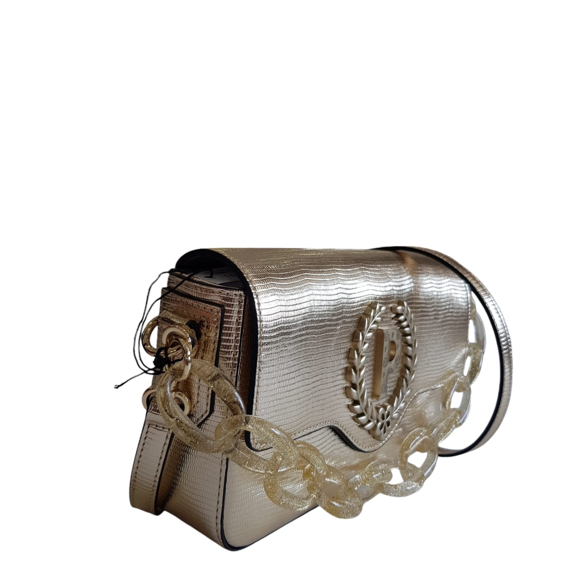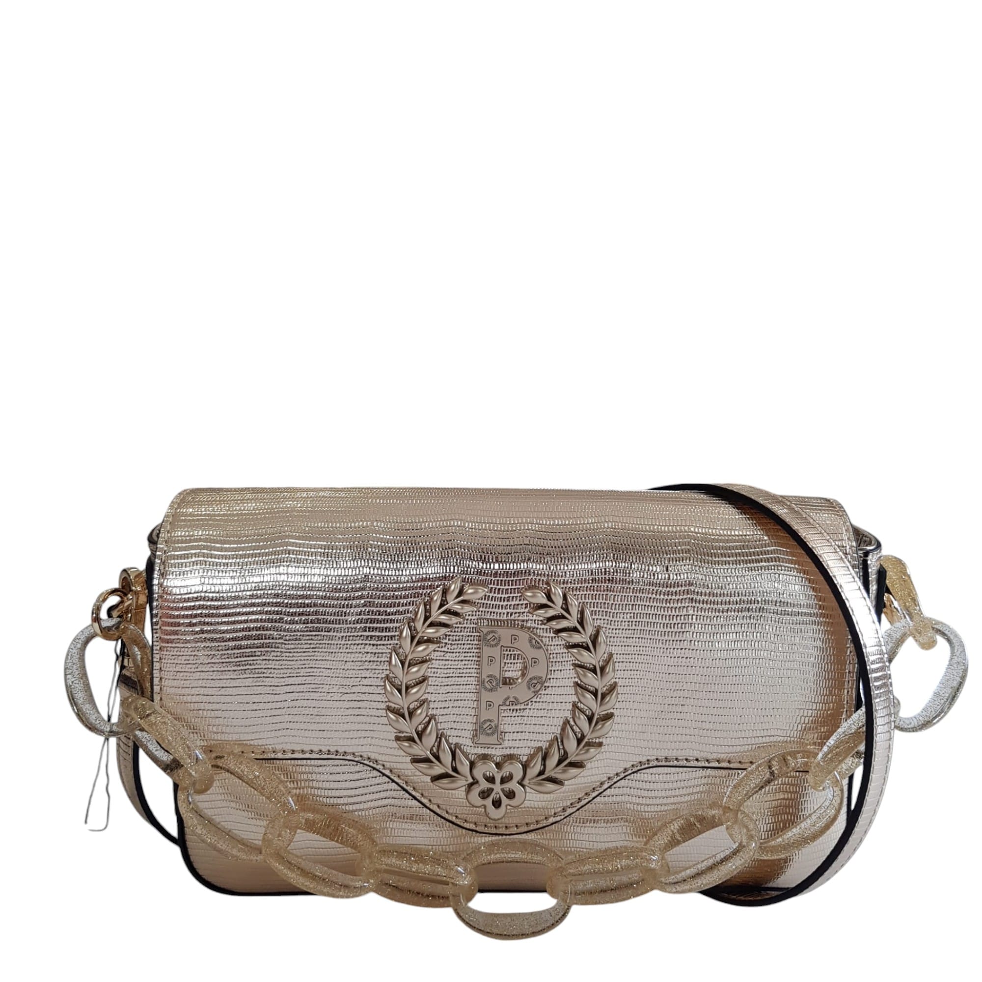 Pollini donna Borsa dalla portabilità molteplice: a mano, a spalla o a tracolla. Maxi catena in tinta con effetto trasparente che funge anche da manico. Maxi logo P-alloro in tinta con pattern Heritage a rilievo. Art.702