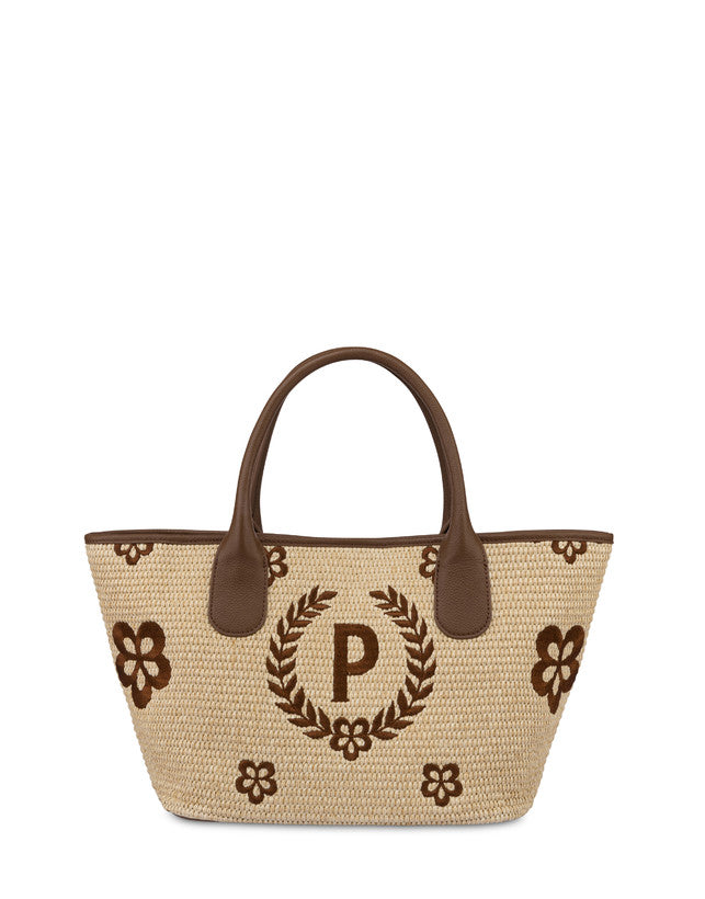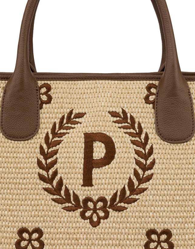 Pollini borsa donna Tote bag, dimensione piccola, collezione Macro Heritage, realizzata in paglia naturale, ideale per l'estate. L'iconico pattern Heritage diventa macro e ricamato nei toni del marrone, in perfetto abbinamento ai riporti in vera pelle. Portabilità a spalla. Rif.868