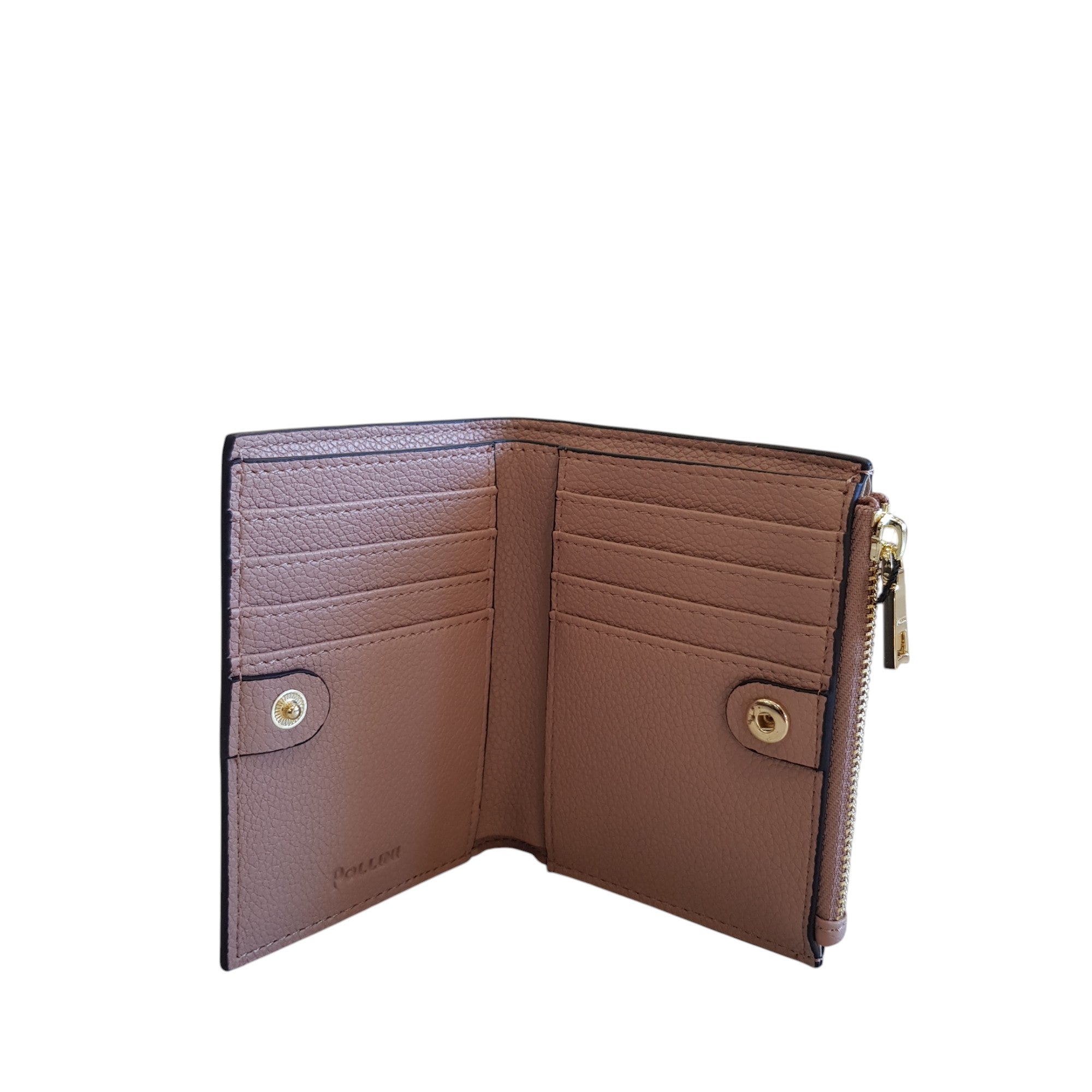 Portacarte nude con logo P-alloro in galvanica oro chiaro. Pratica organizzazione interna con vani per carte, banconote e documenti. Tasca portamonete con zip. Art.465