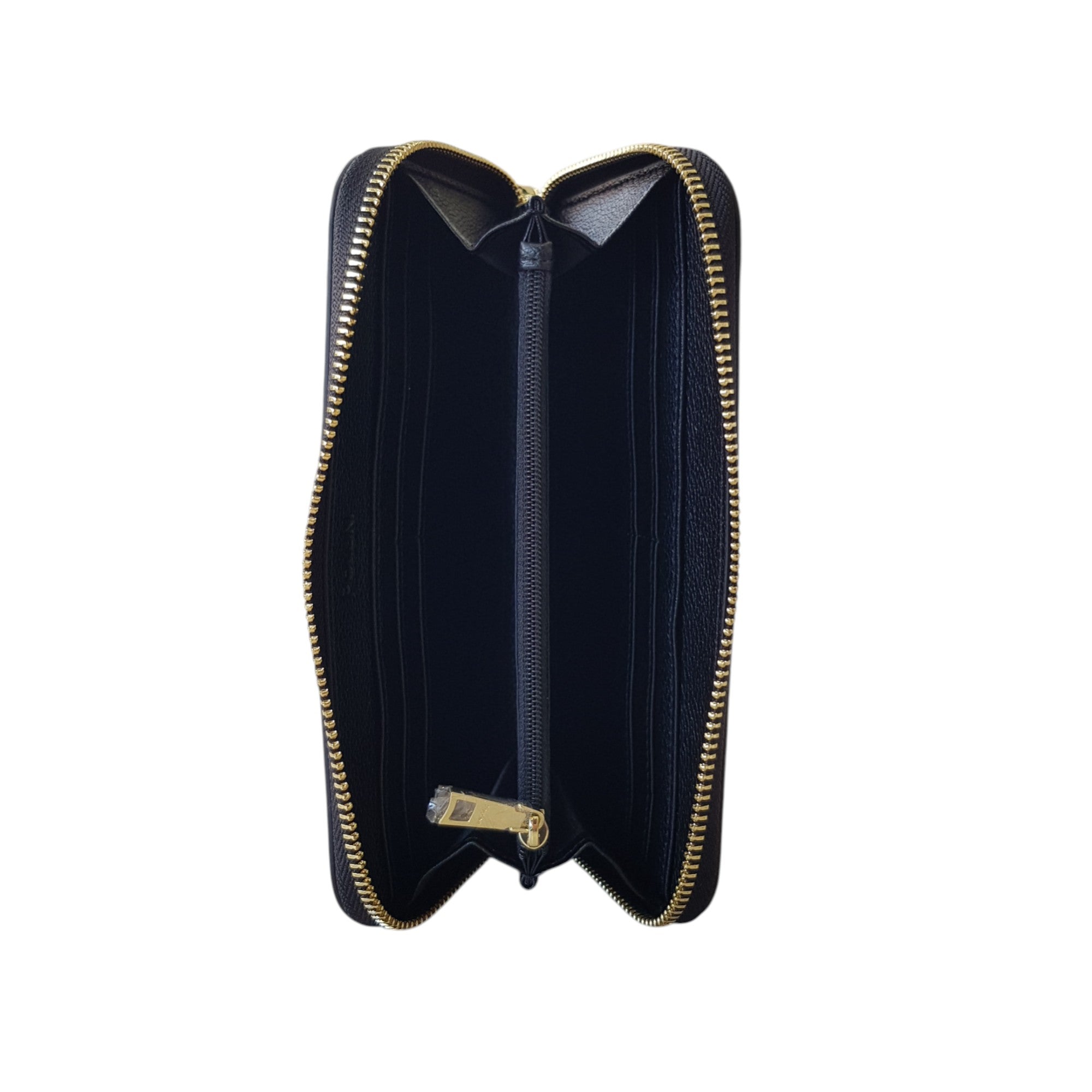 Portafoglio zip around. L'iconico logo in galvanica oro chiaro centrale e sobrio. Ampia organizzazione interna.