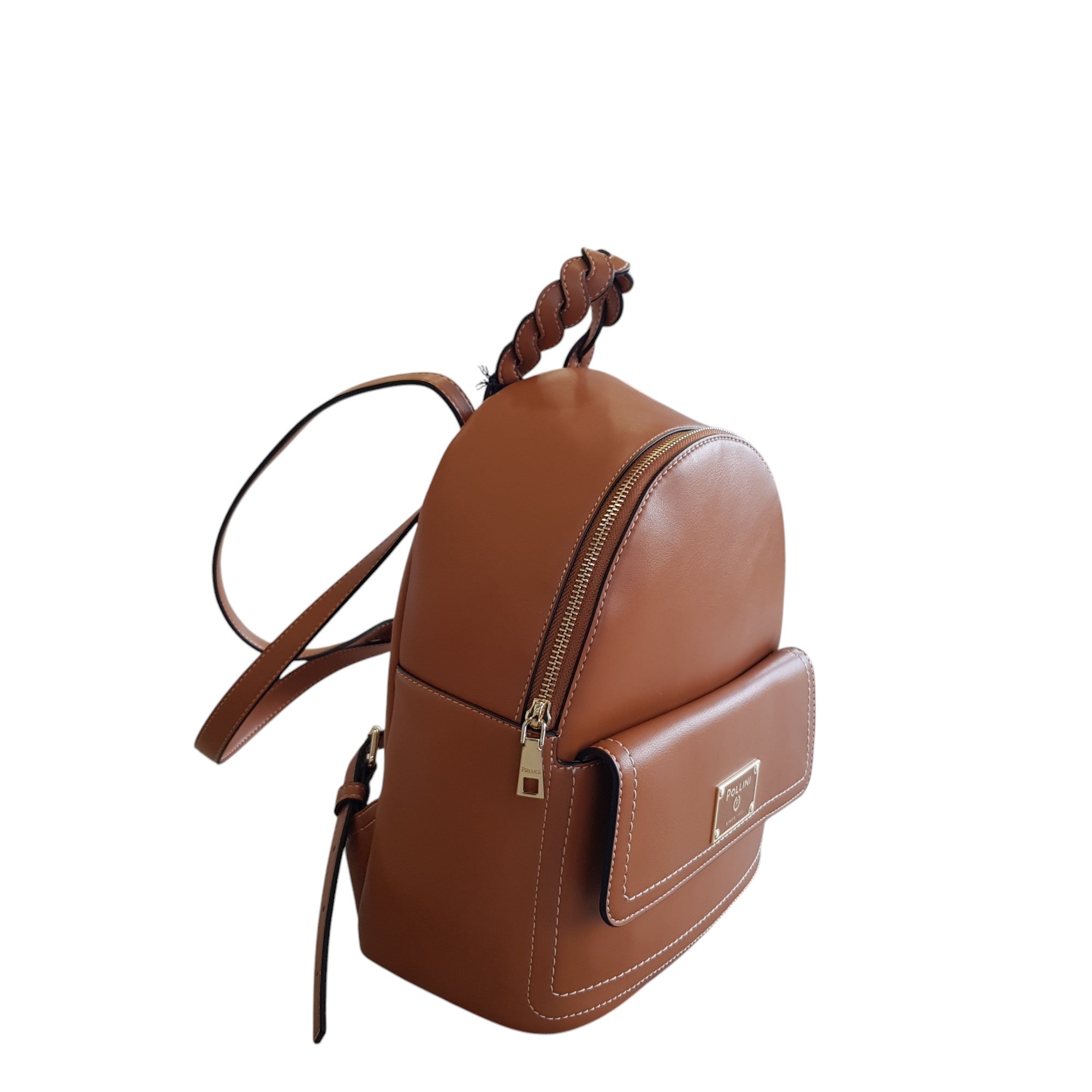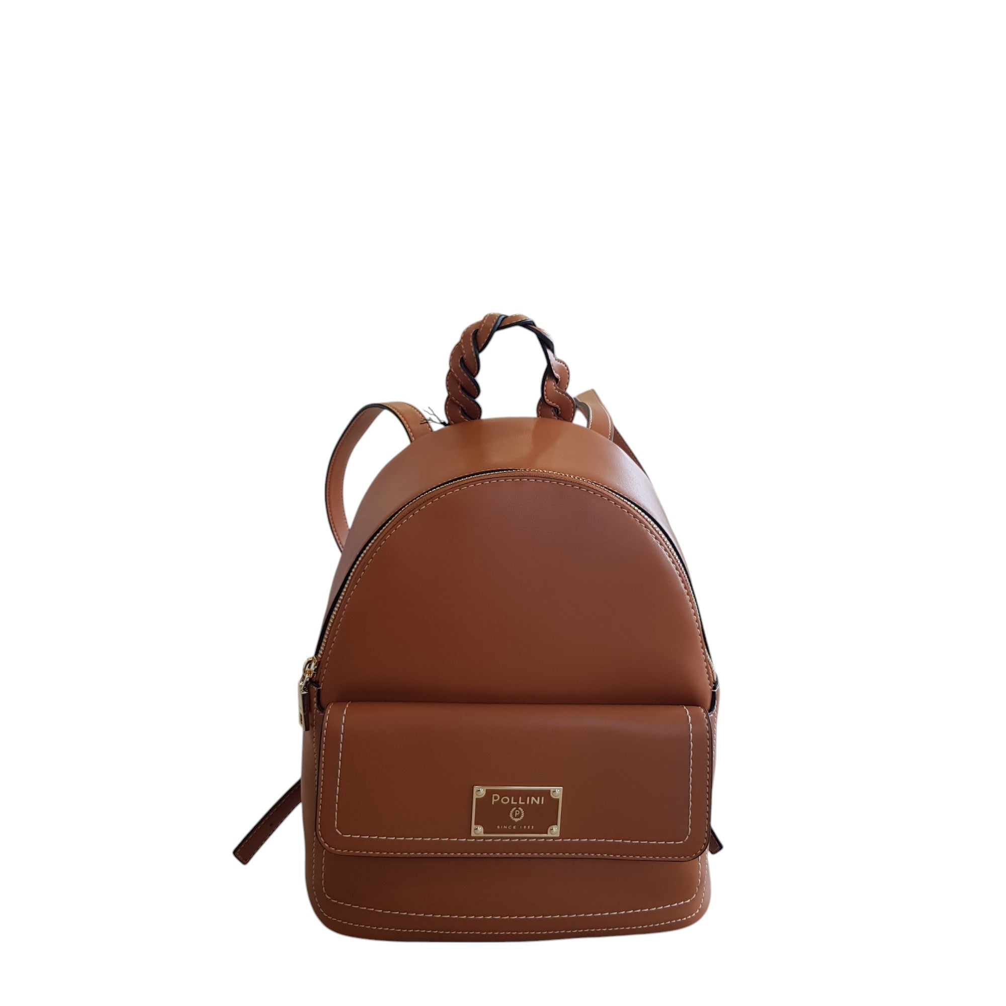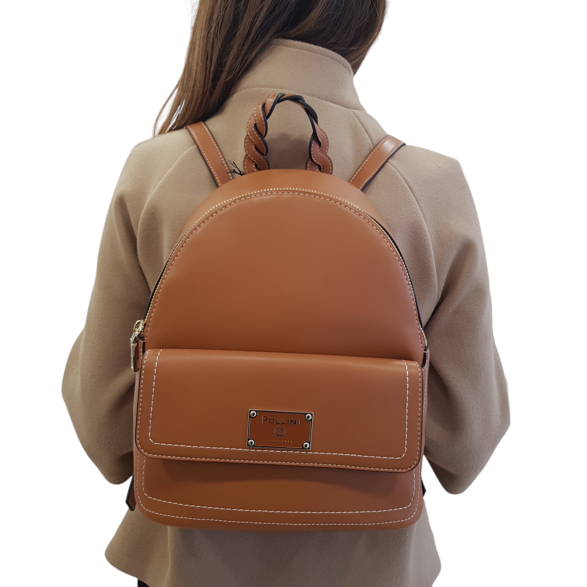 Zaino con targhetta logata smaltata e manigliotto intrecciato. La doppia cucitura écru a filo grosso, posta sia sul quadrante frontale che sulla patta, sottolinea la qualità e l'attenzione ai dettagli tipici di Pollini. Art.777