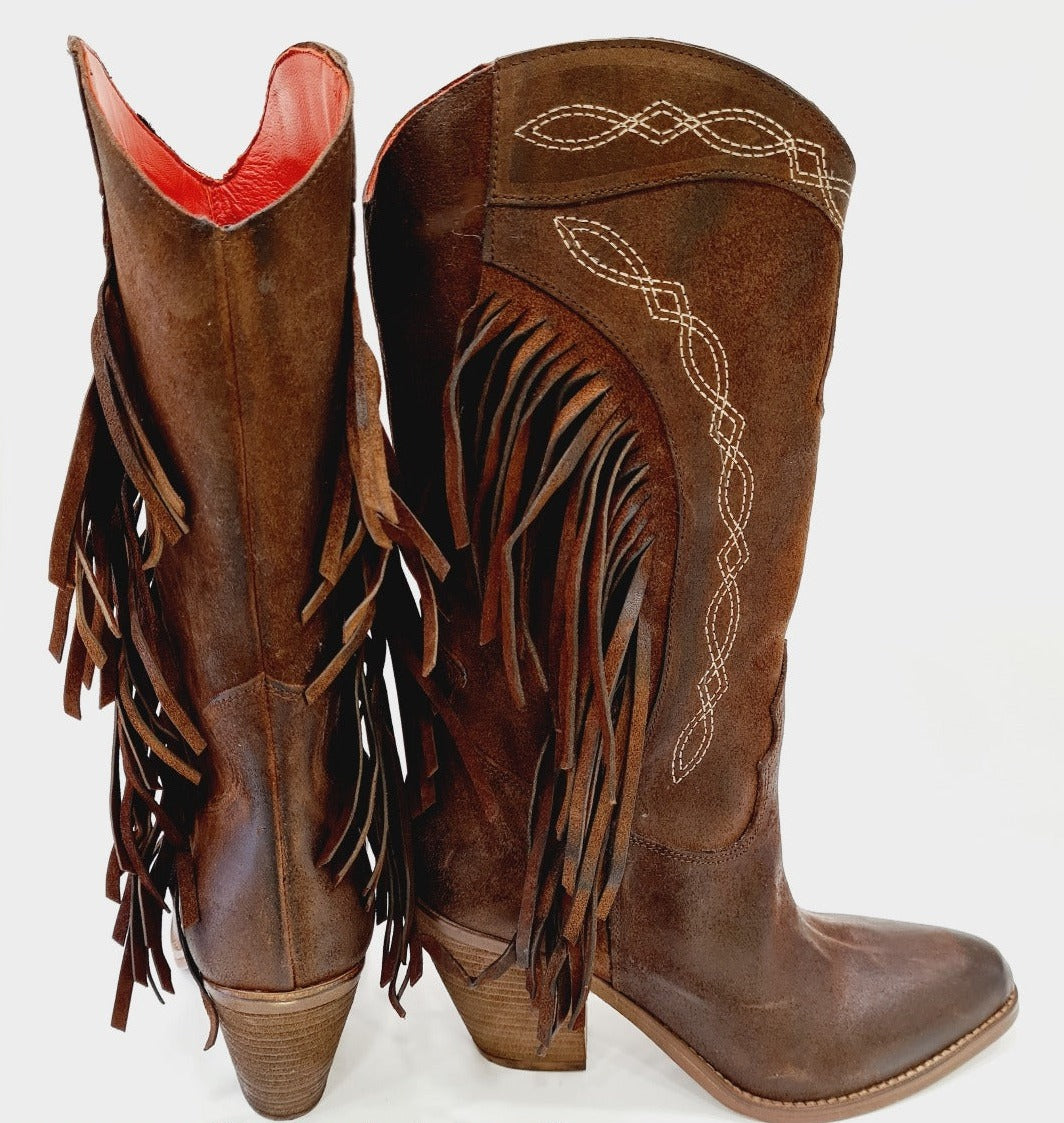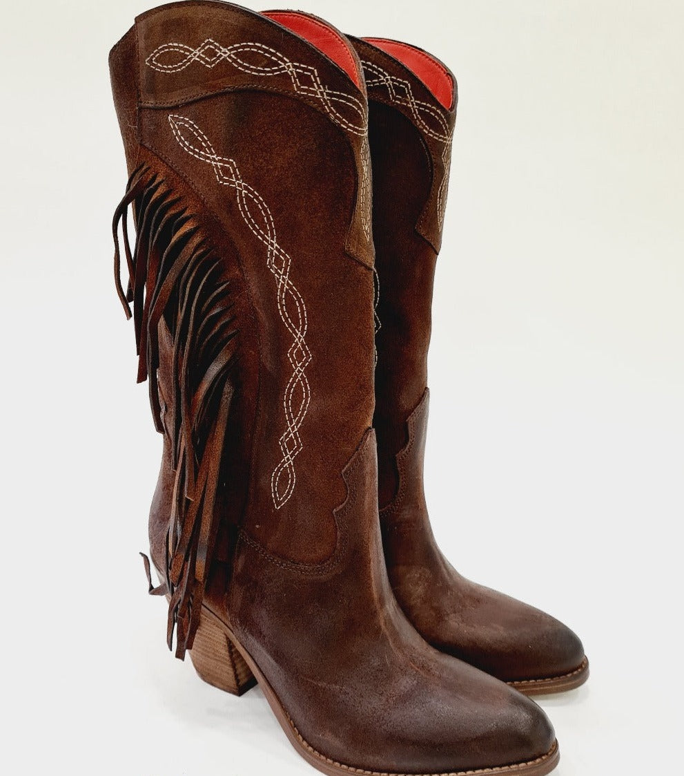 Zoe stivale texano frange tacco 9 cm crosta tabacco rif.18